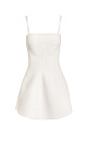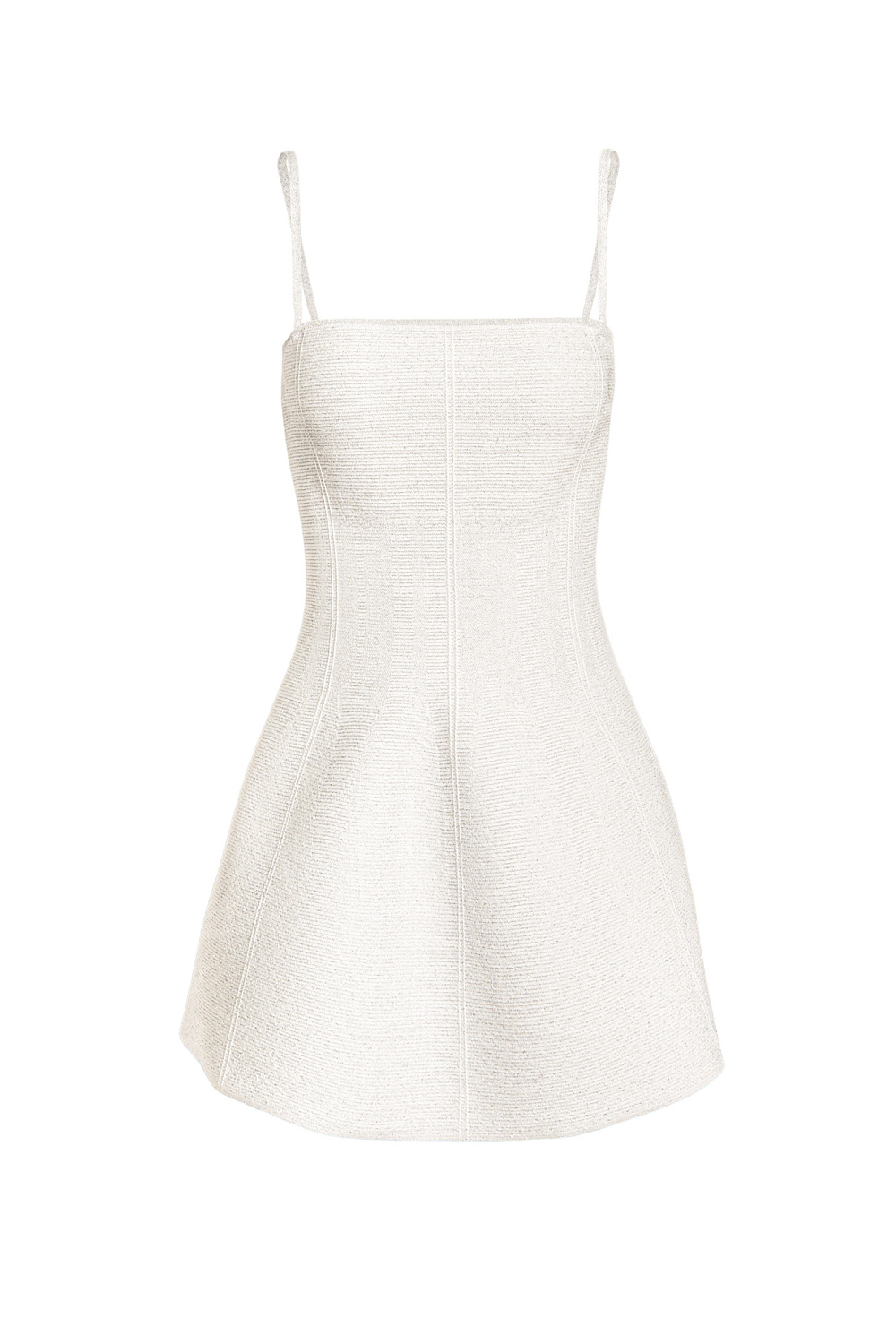 Mini-length knitted dress with lurex. Model of a fitted silhouette with straps. The straps are removable. Zip closure.