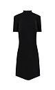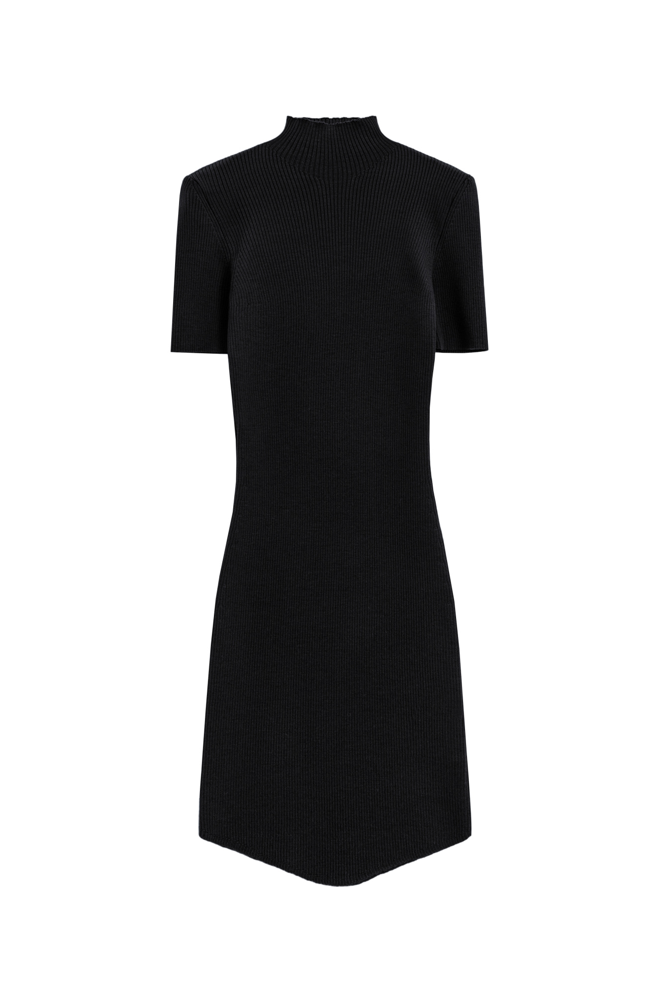 A mini-length knit dress made of viscose with added wool. It features a fitted silhouette, short sleeves, a low collar, and an arched hem. The dress is ribbed.
