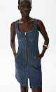 Cotton mini length denim dress. The model has a fitted silhouette with wide straps, two side pockets, back pockets and a zipper closure. The dress has a seam bodice with decorative seams.