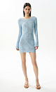 Organic cotton knitted mini dress. The model has a fitted silhouette, with long flared sleeves, slits at the cuffs and a round neckline. The product is decorated with voluminous floral patterns.