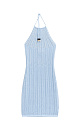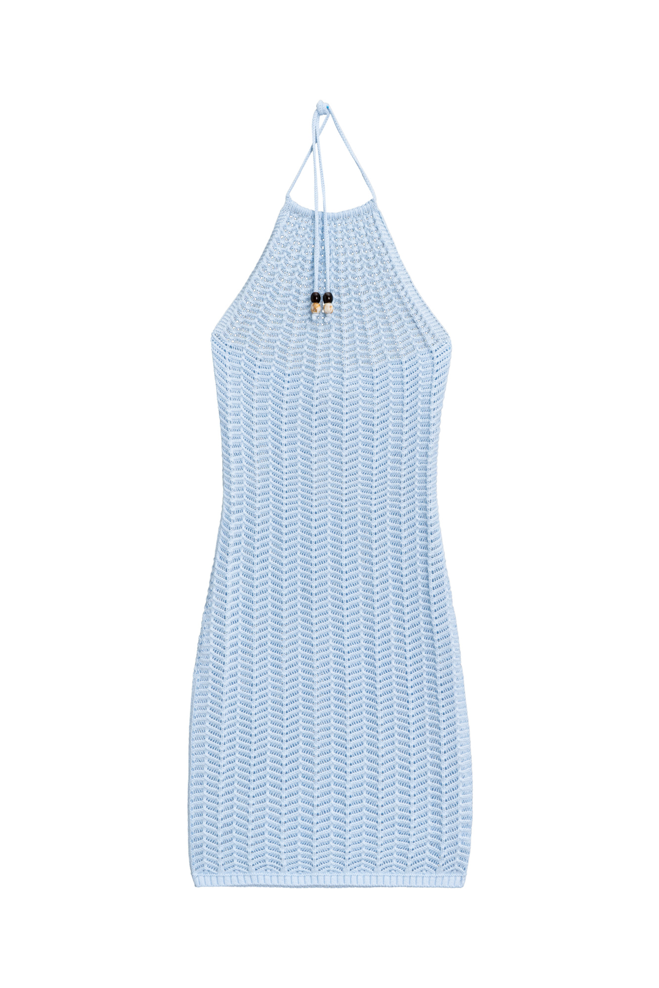Knitted openwork cotton dress. The model has a fitted silhouette, sleeveless, with an open back and a halter neckline with thin ties with beads.