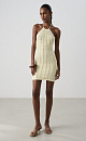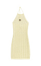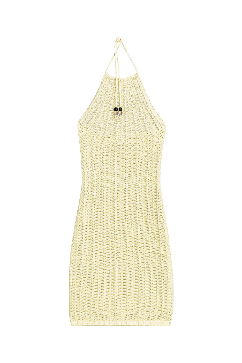 Knitted openwork cotton dress. The model has a fitted silhouette, sleeveless, with an open back and a halter neckline with thin ties with beads.