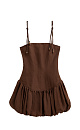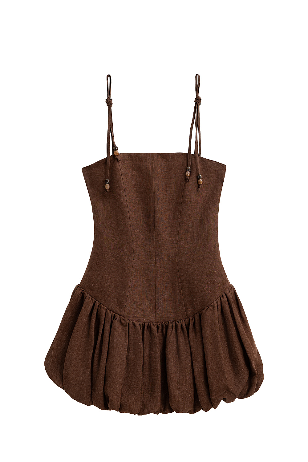 Mini-length dress made of 100% linen with a balloon skirt. The model has a fitted silhouette, with a corset top, and thin straps decorated with large beads. The back of the product is made with elastic.