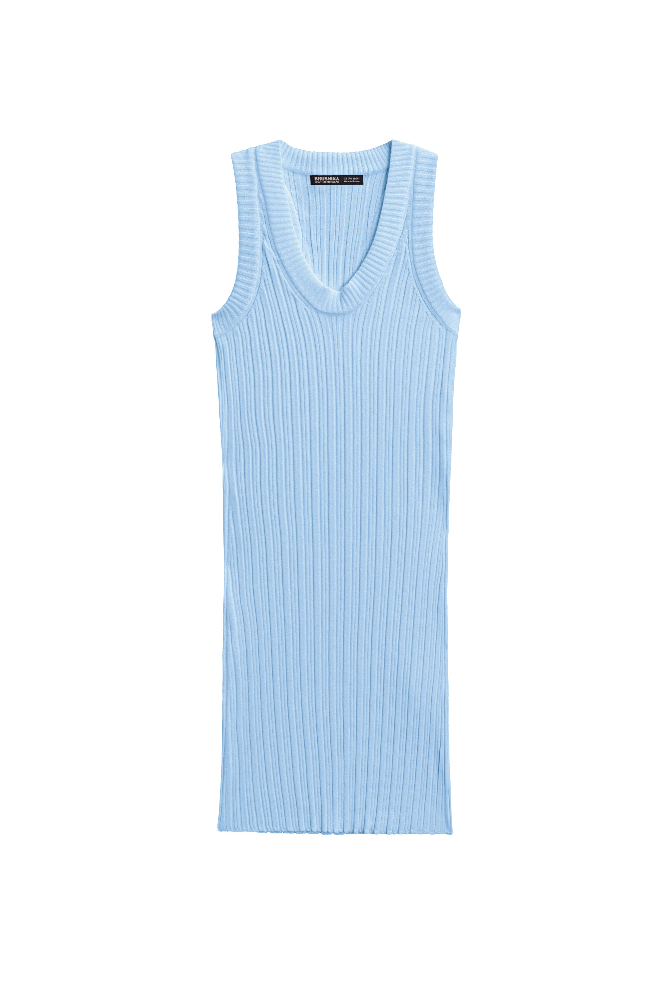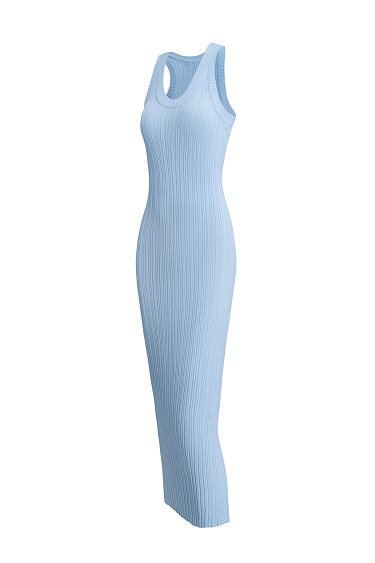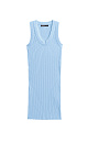 Mini-length dress made of textured viscose jersey. The model has a fitted silhouette, sleeveless, wide straps, and a U-shaped neckline. The product is made with a wide rib.