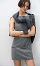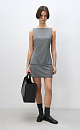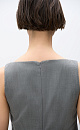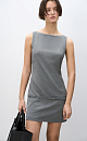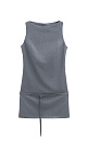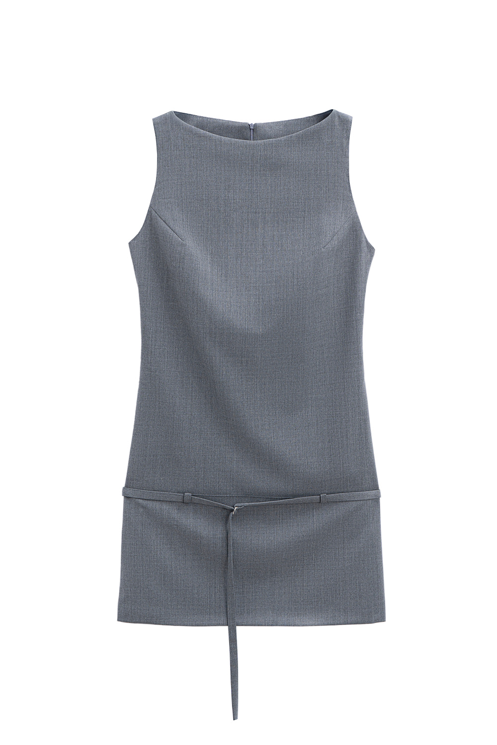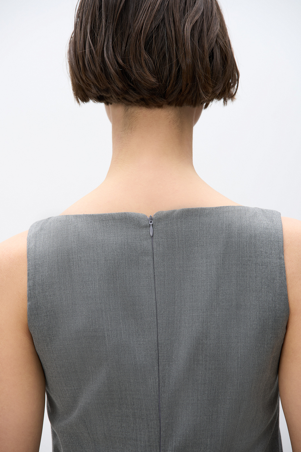 Mini-length sheath dress made of wool. The model has a straight cut, sleeveless, and a boat neckline. The product is decorated with belt loops and a thin strap on the hips. Zip fastening at the back.