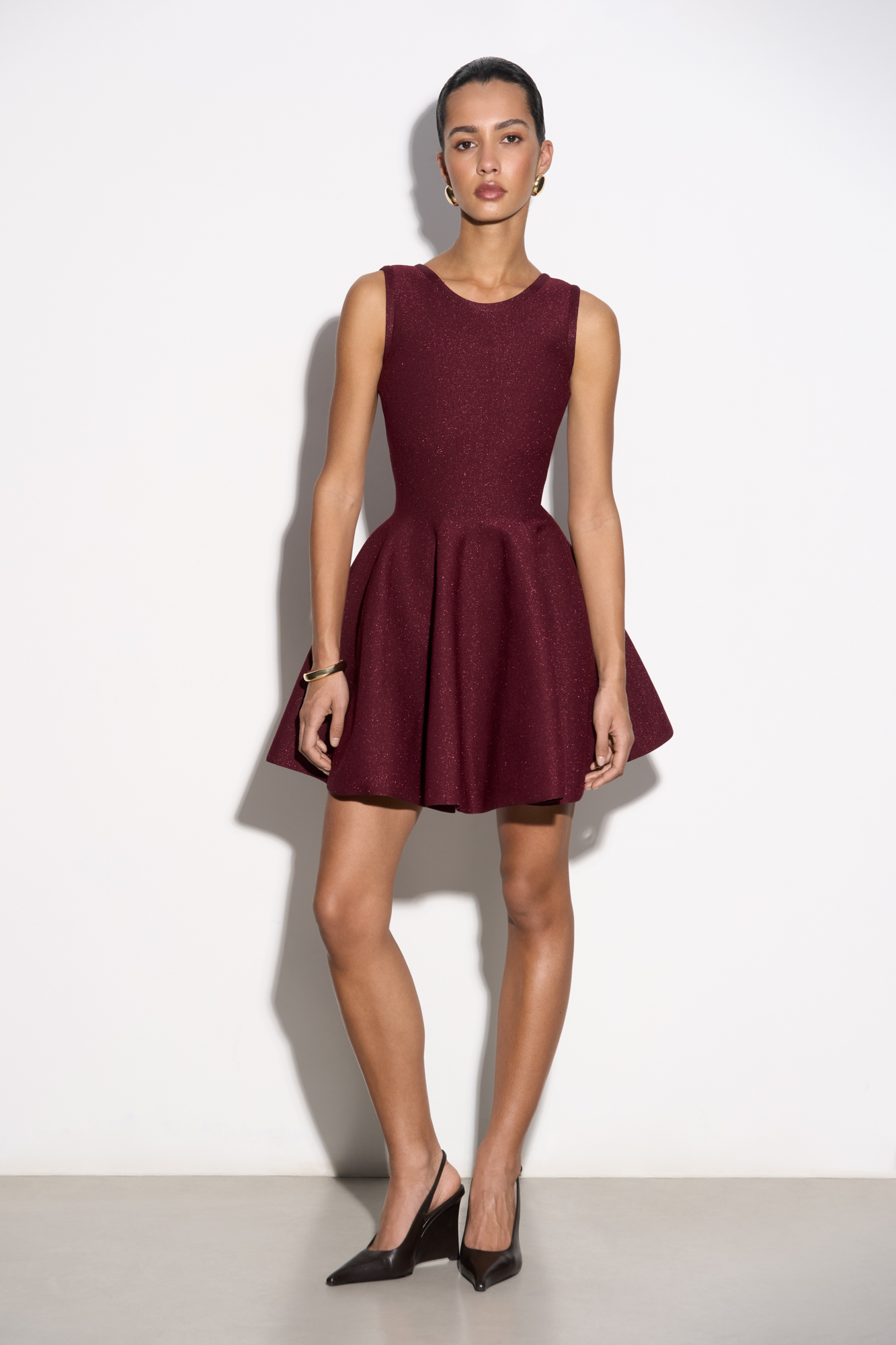 Mini-length knitted dress with lurex. A fitted model with a skirt flared from the waist, sleeveless, with wide straps.