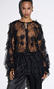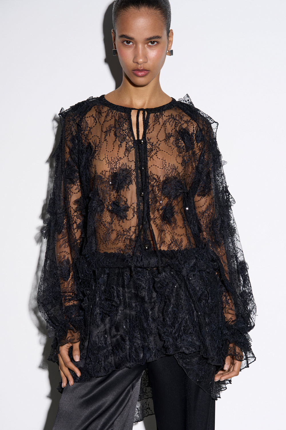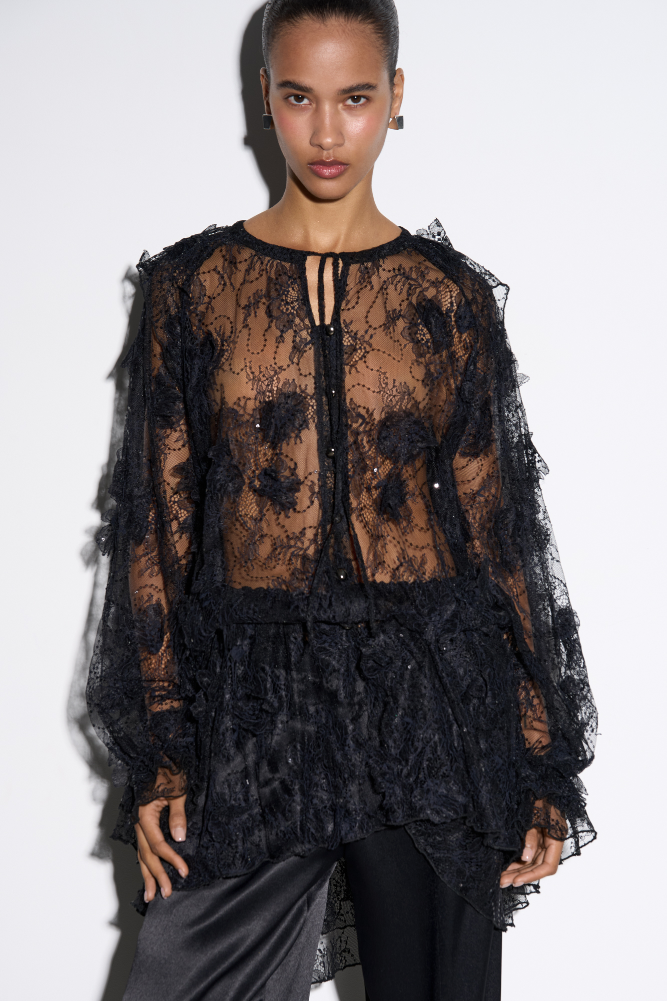 Mini-length dress made of thin lace with voluminous flower decoration. Loose fit model with long sleeves, cuffs and a round neckline with frill. Button closure. The neckline is secured at the neck with a thin cord. The product is made without lining.