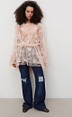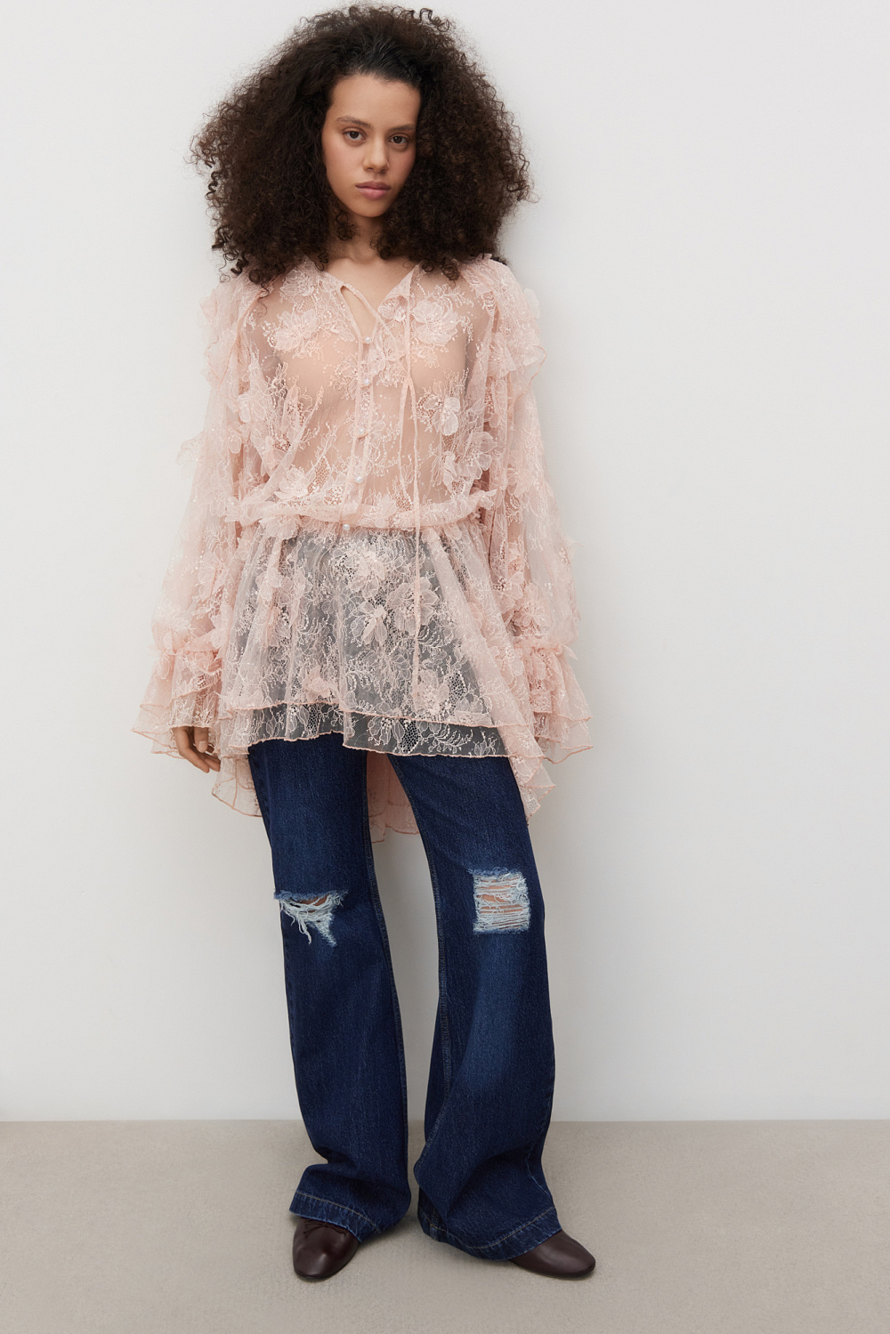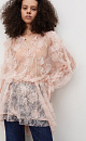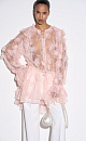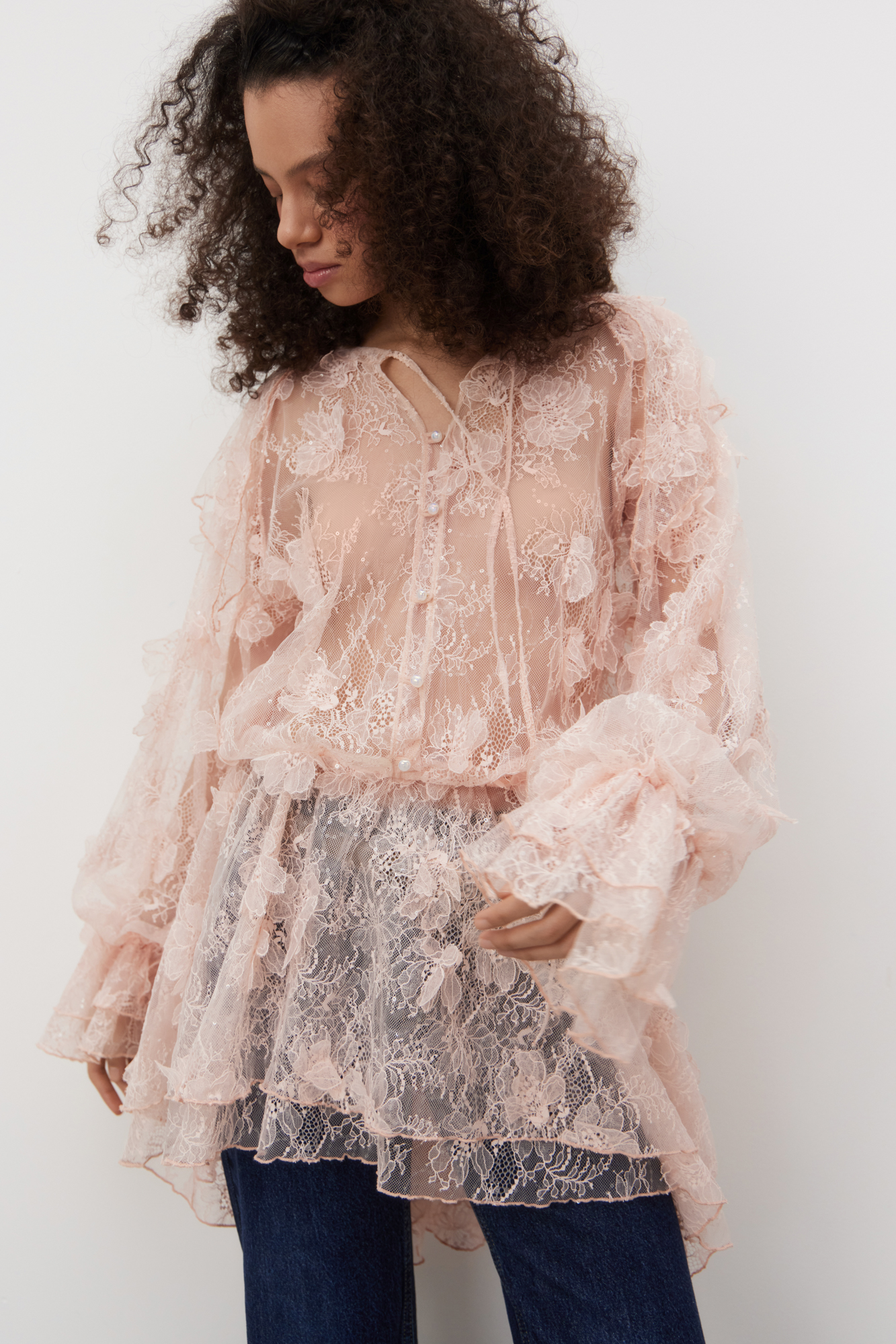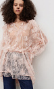 Mini-length dress made of thin lace with voluminous flower decoration. Loose fit model with long sleeves, cuffs and a round neckline with frill. Button closure. The neckline is secured at the neck with a thin cord. The product is made without lining.