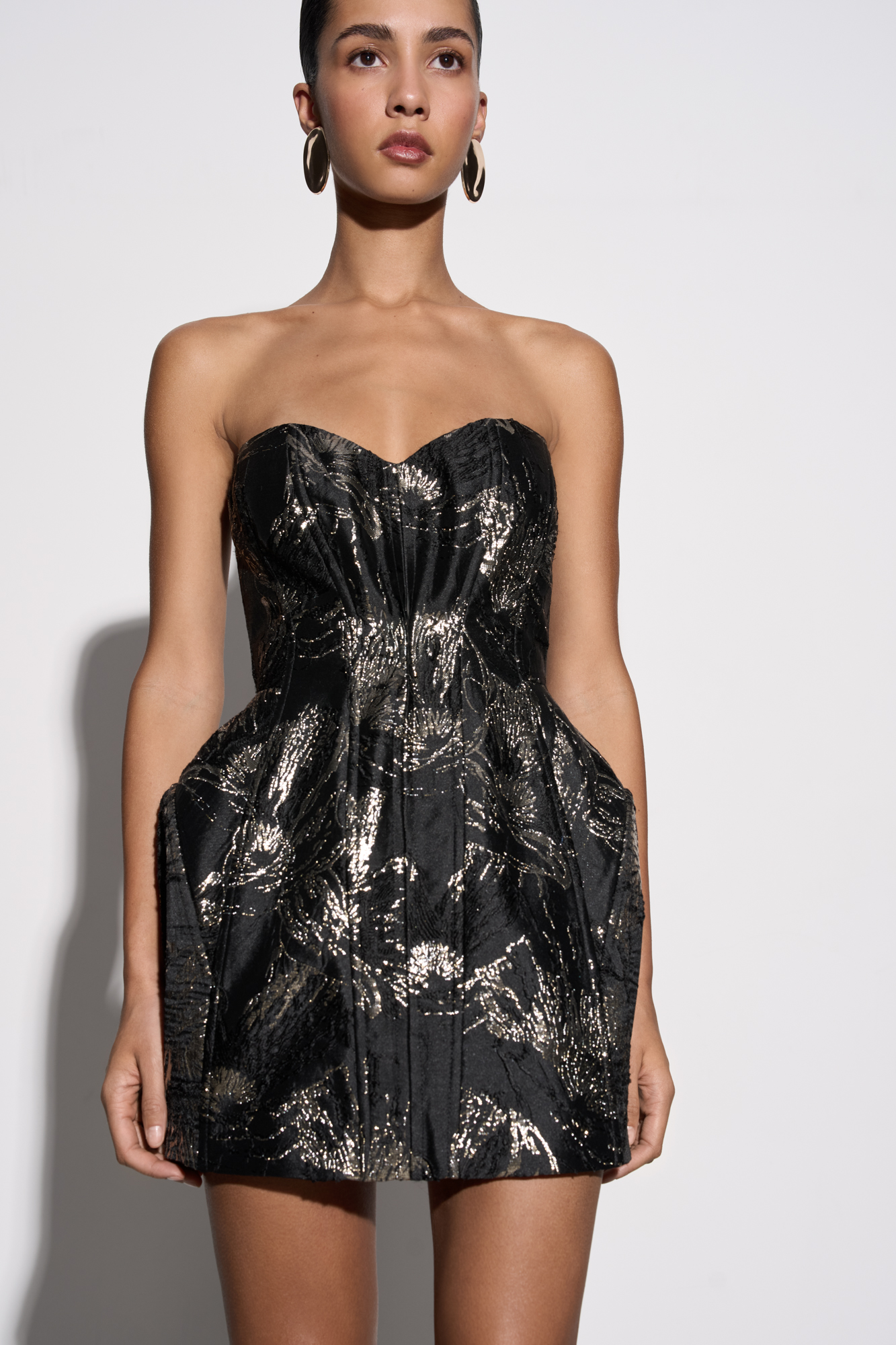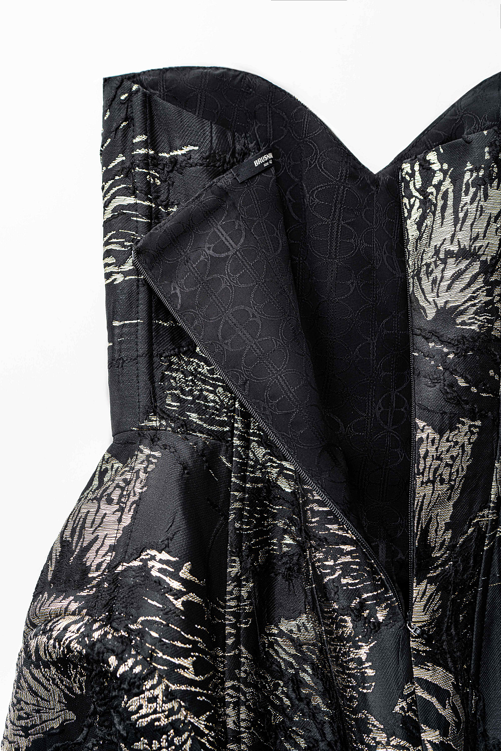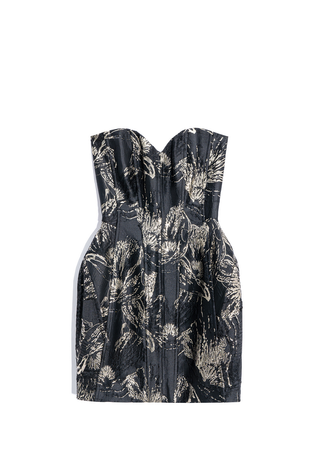 Mini-length dress made of jacquard. Model with a corset top and a figured neckline. Concealed zip fastening at the back. The product is lined.
