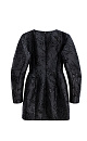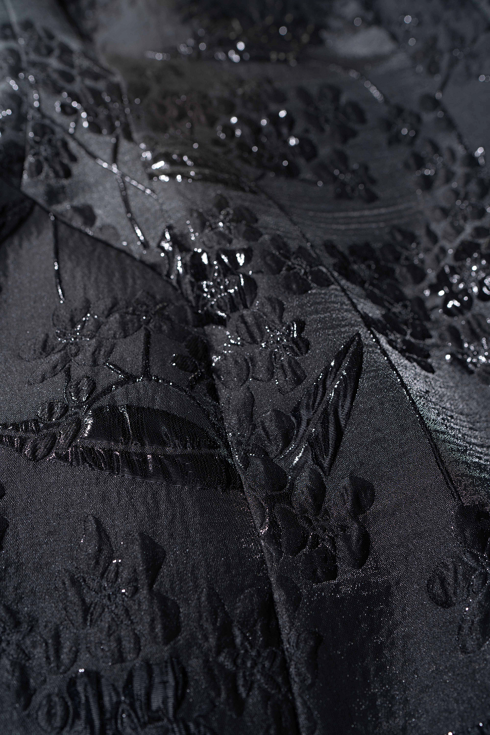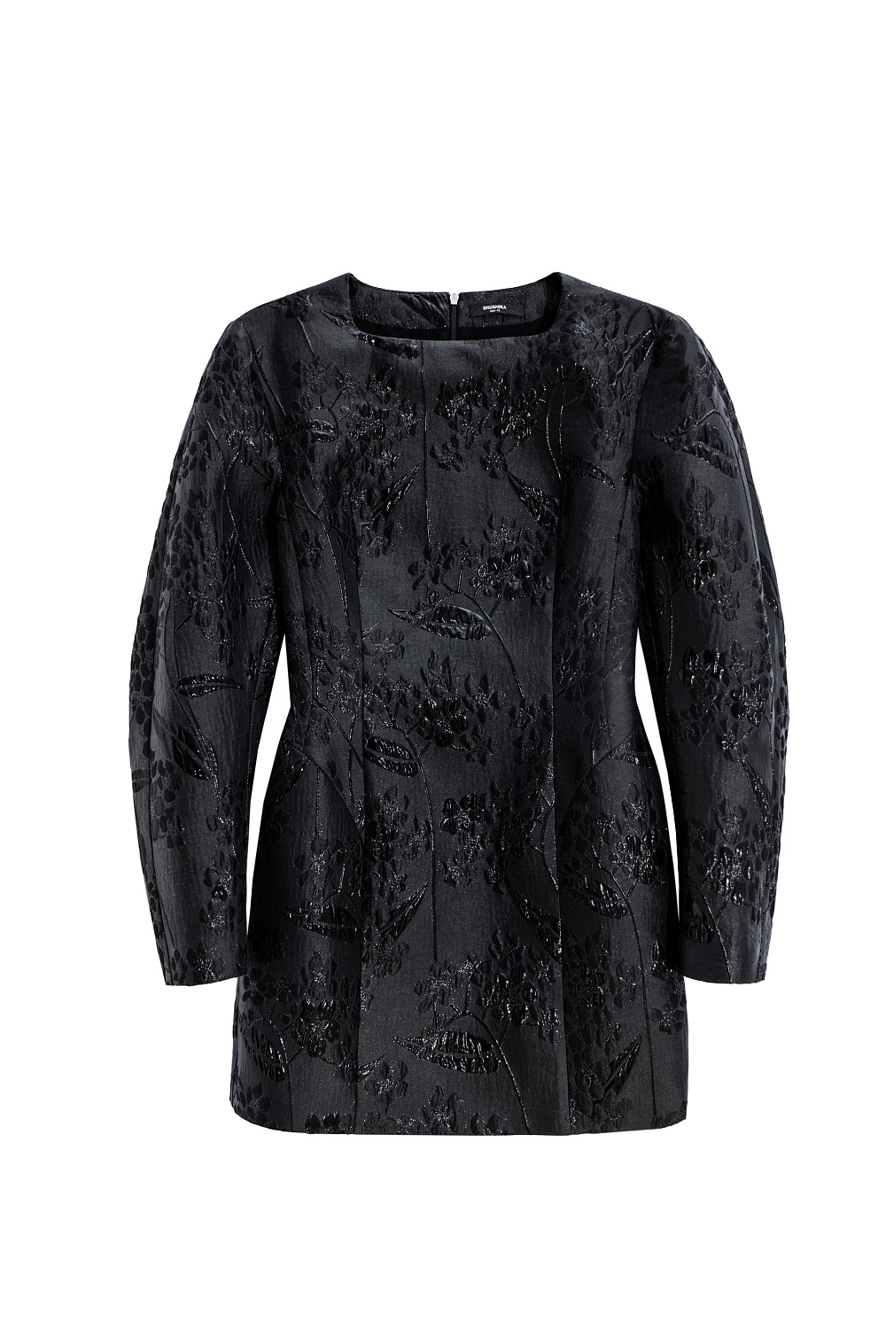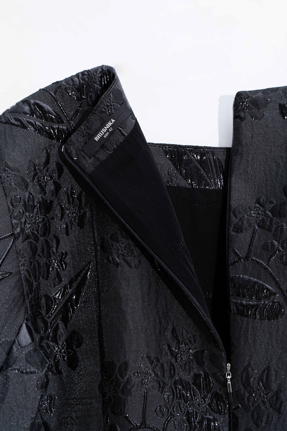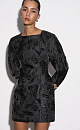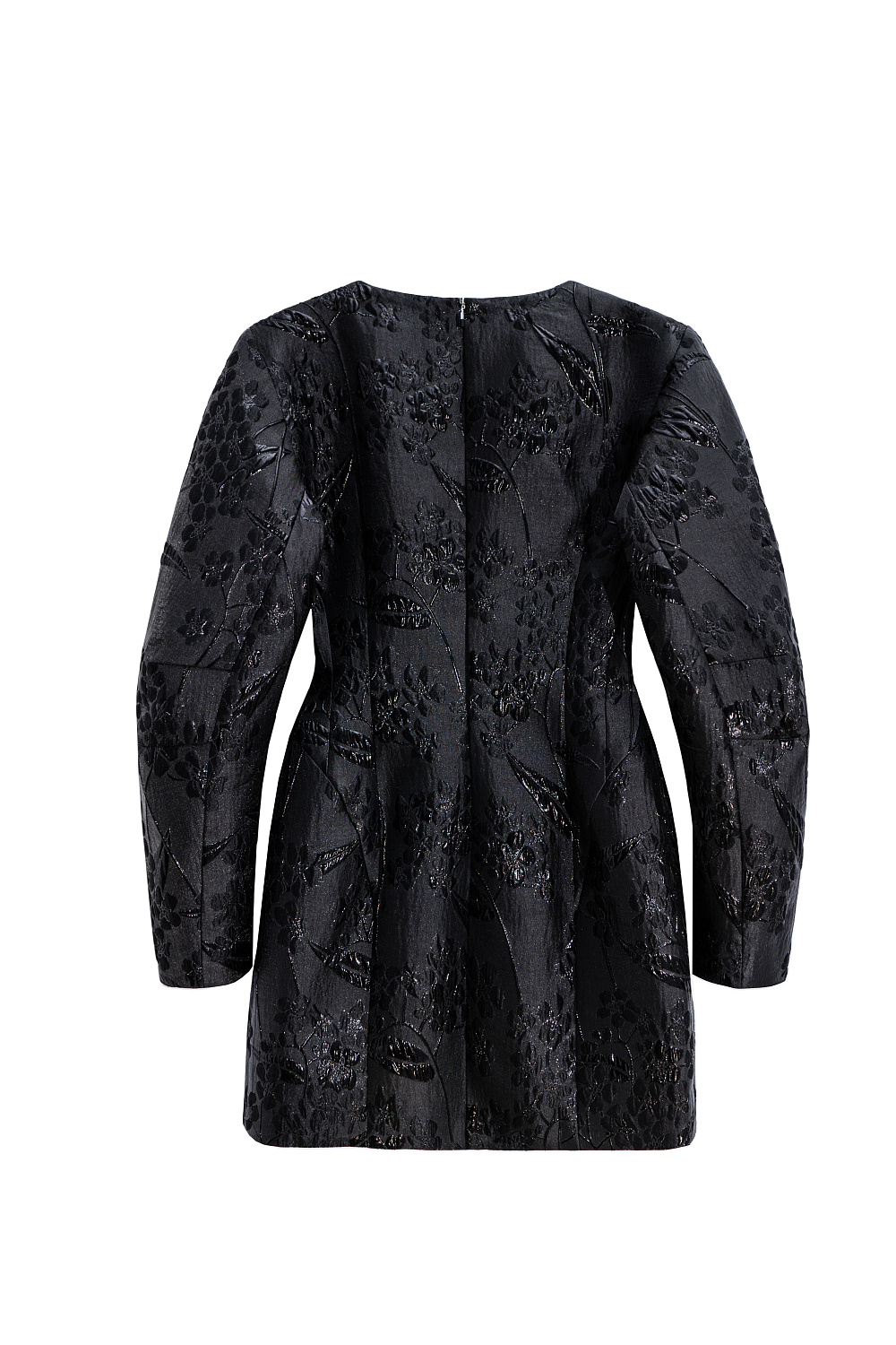 Mini-length dress made of crinkled jacquard with floral patterns. Straight fit model with long sleeves and square neckline. The product is lined. Zip fastening on the back.