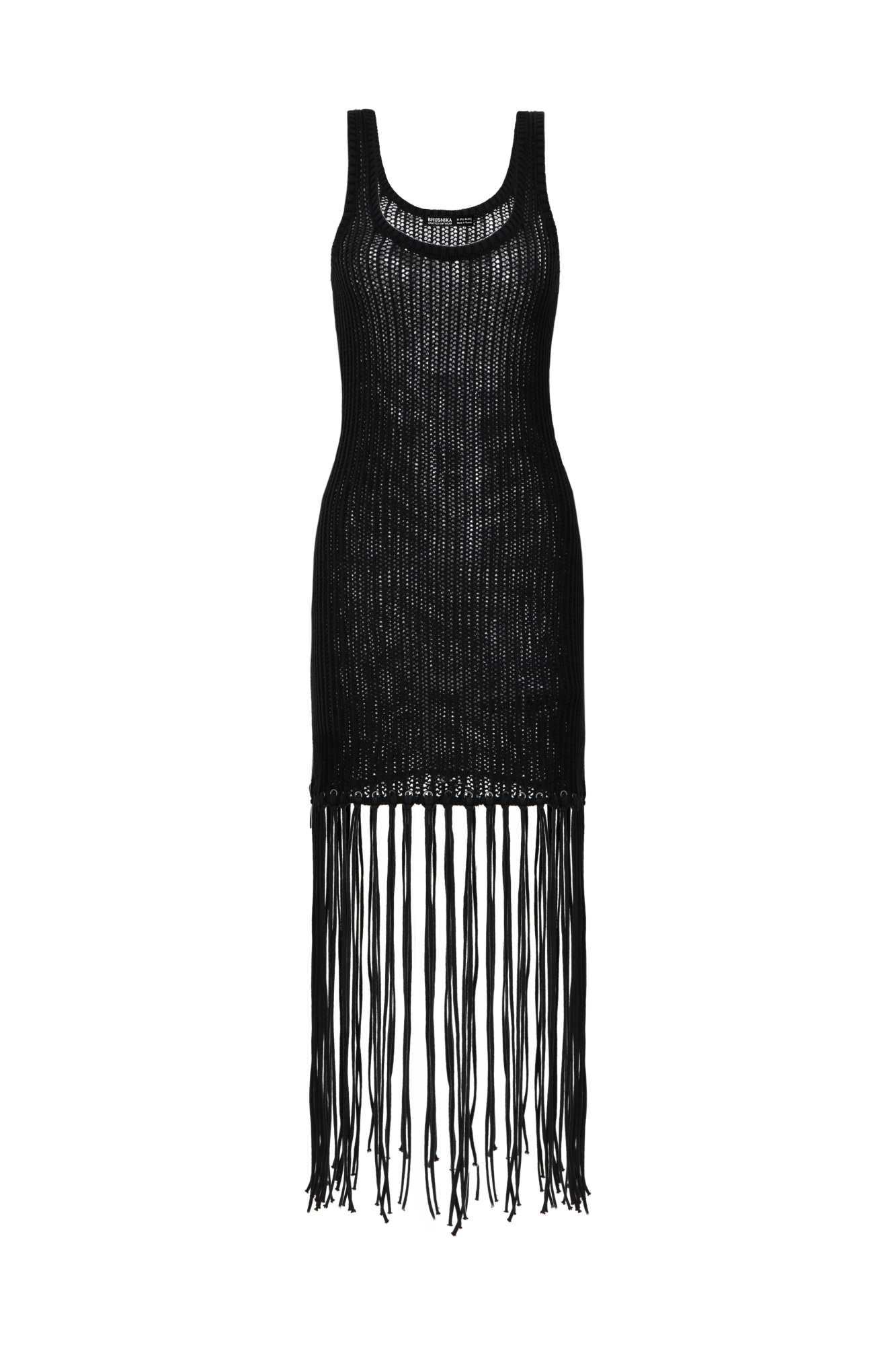 100% knitted mesh summer dress with fringes and eyelets.