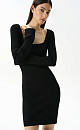 A mini knit sheath dress with a fitted silhouette, long sleeves, and a square neckline.
