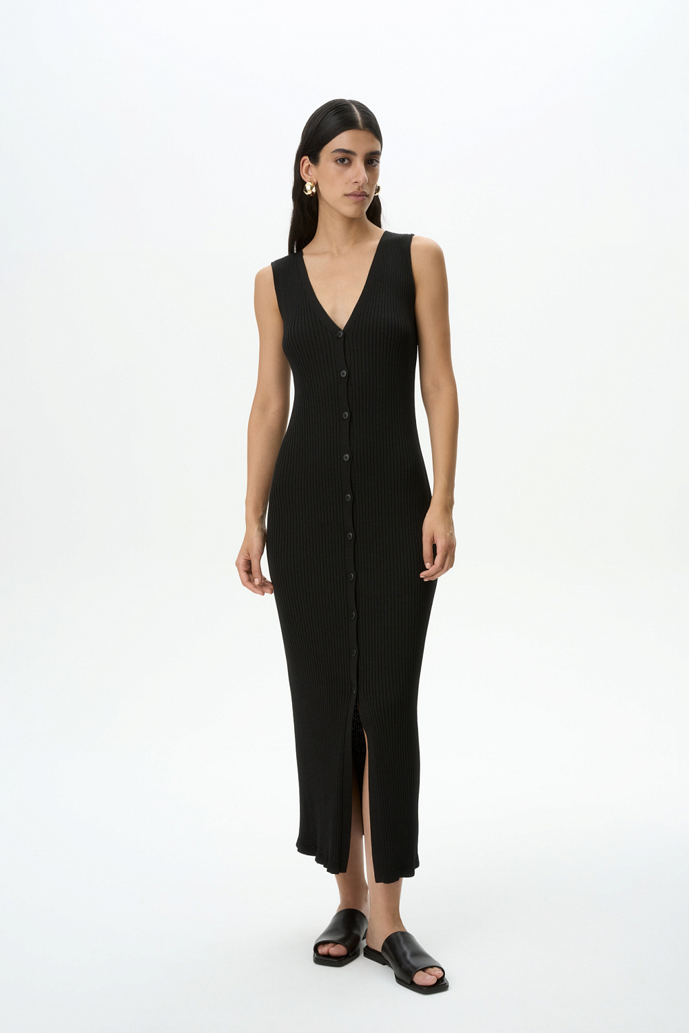 Knit sleeveless fitted midi dress with button closure.