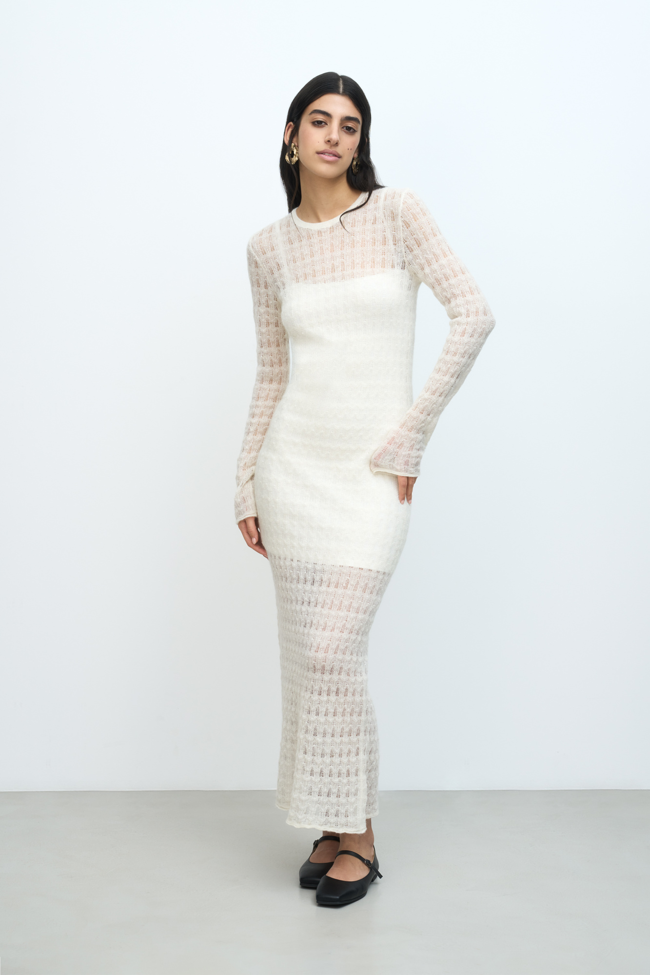 Knitted openwork dress. The model has a straight silhouette and is made from the finest yarn - a mixture of superkid mohair. Includes underslip dress.