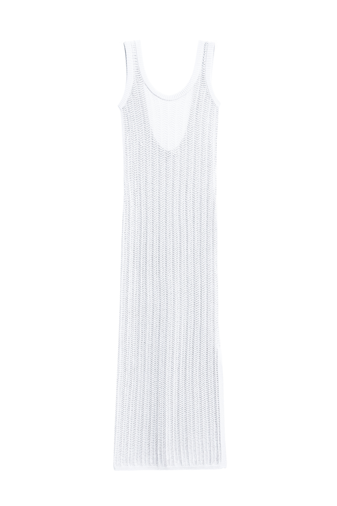 Knitted openwork sundress made of viscose. The model has a loose silhouette, sleeveless, thin straps and an open back. The knitting is made in a herringbone pattern, the edges of the product are ribbed.