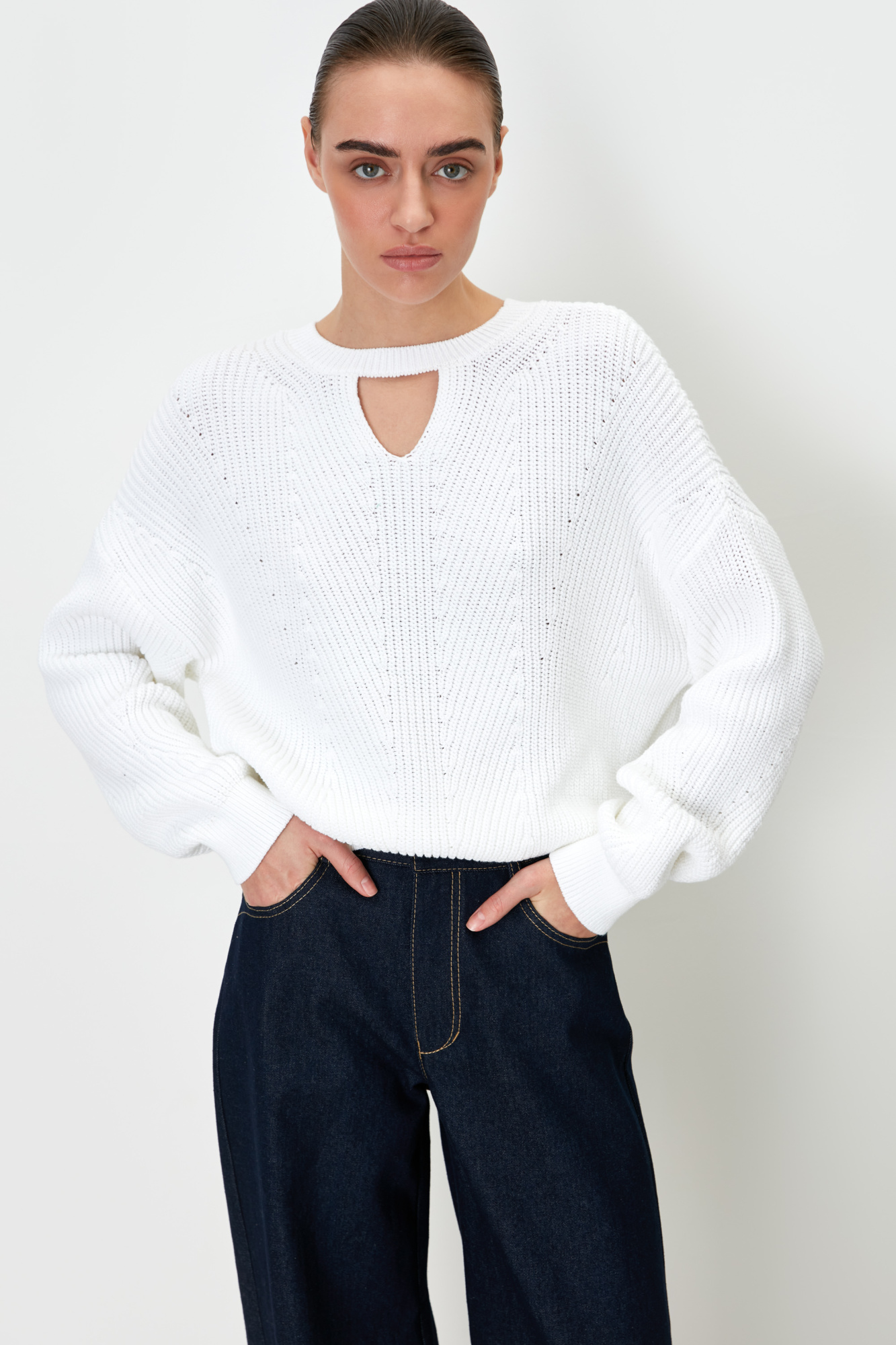 Knitted cotton jumper with neckline cutout.