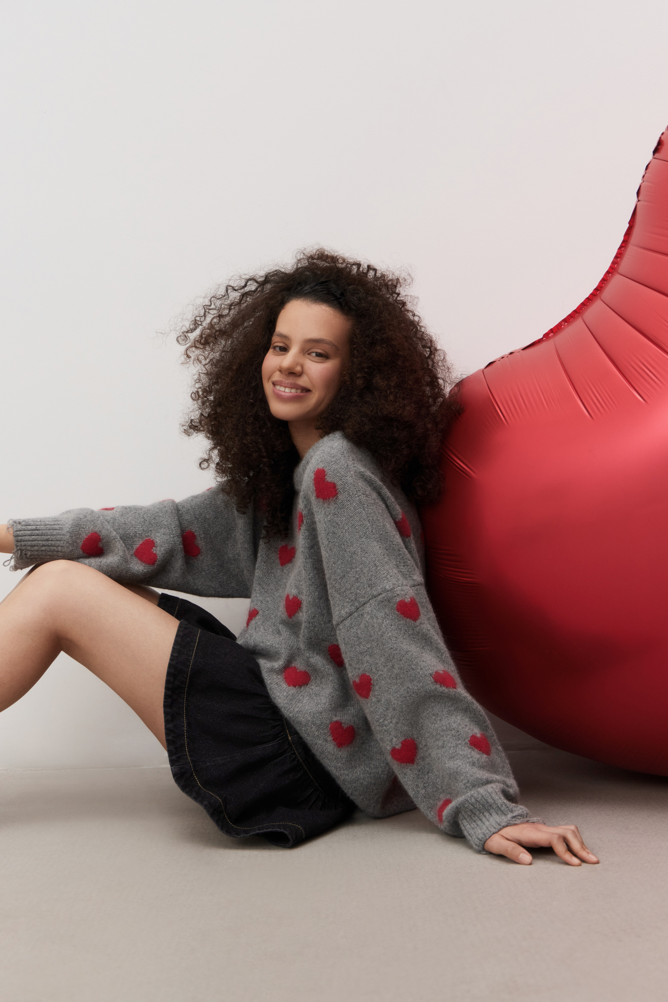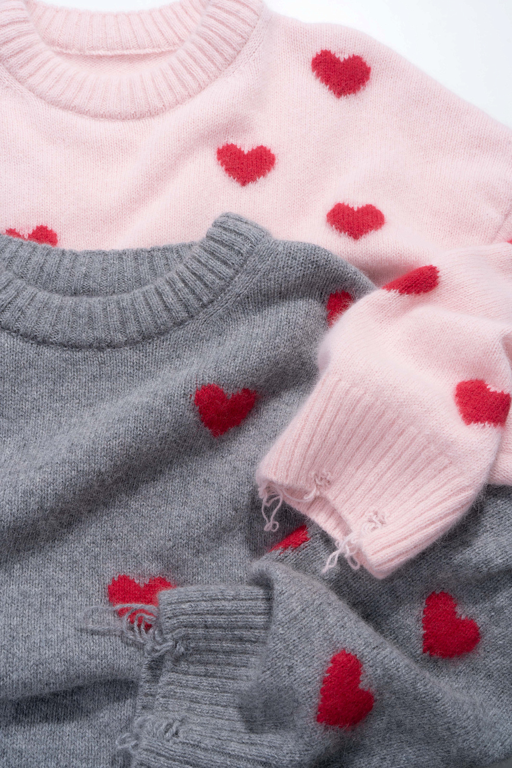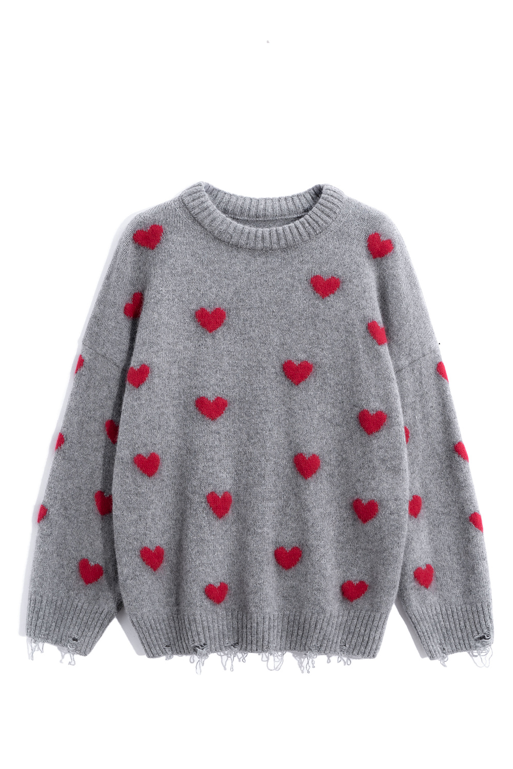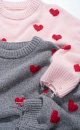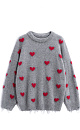 Jumper made of wool and fox down with a jacquard heart pattern. Loose silhouette model with dropped shoulders and a round neckline. The sleeve cuffs and hem are made in a wide rib with slits in a grunge style.