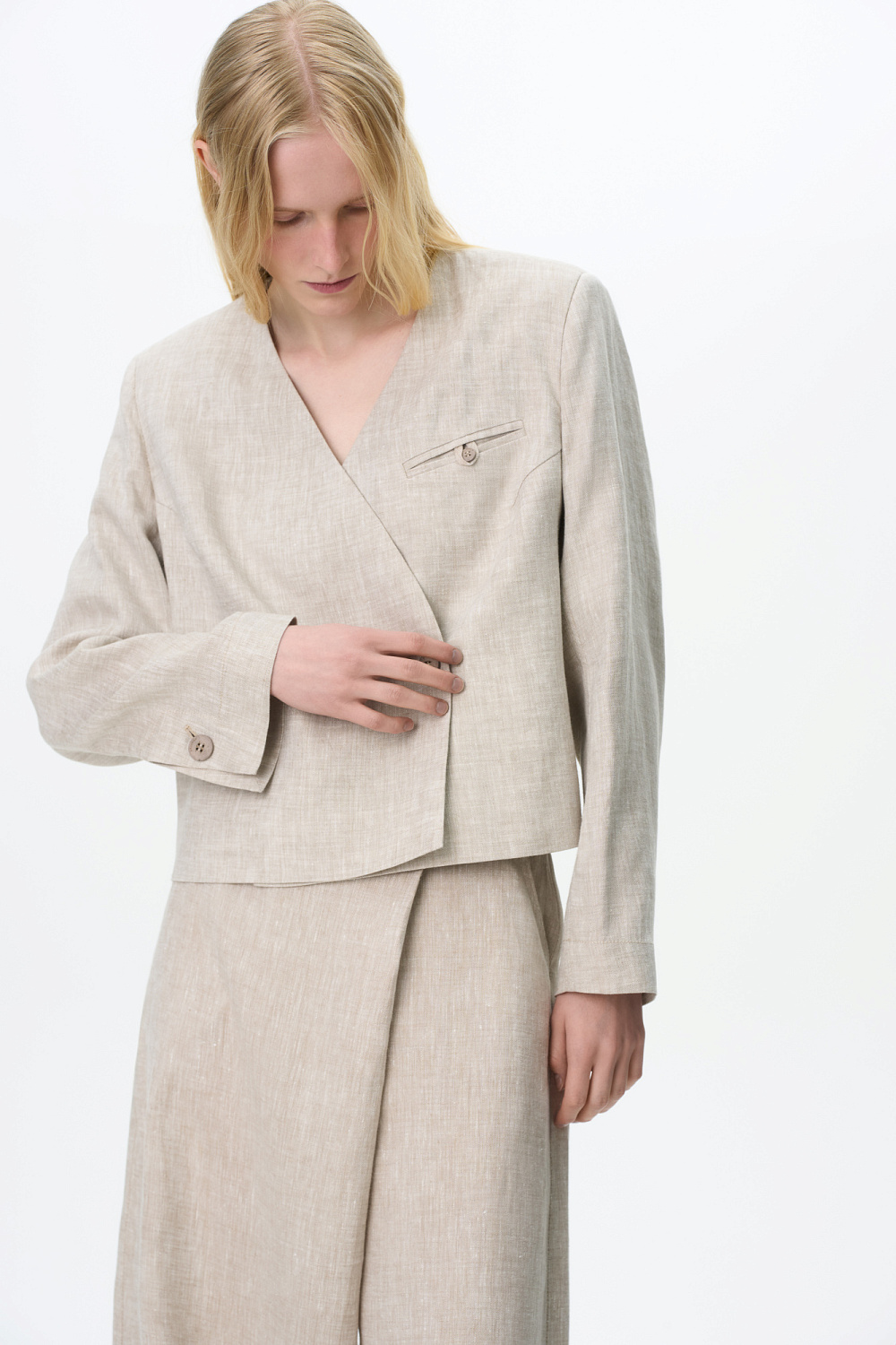 Fitted cropped wrap blazer. Features pocket on the chest and a button closure at the front. You can complete the look with matching trousers.