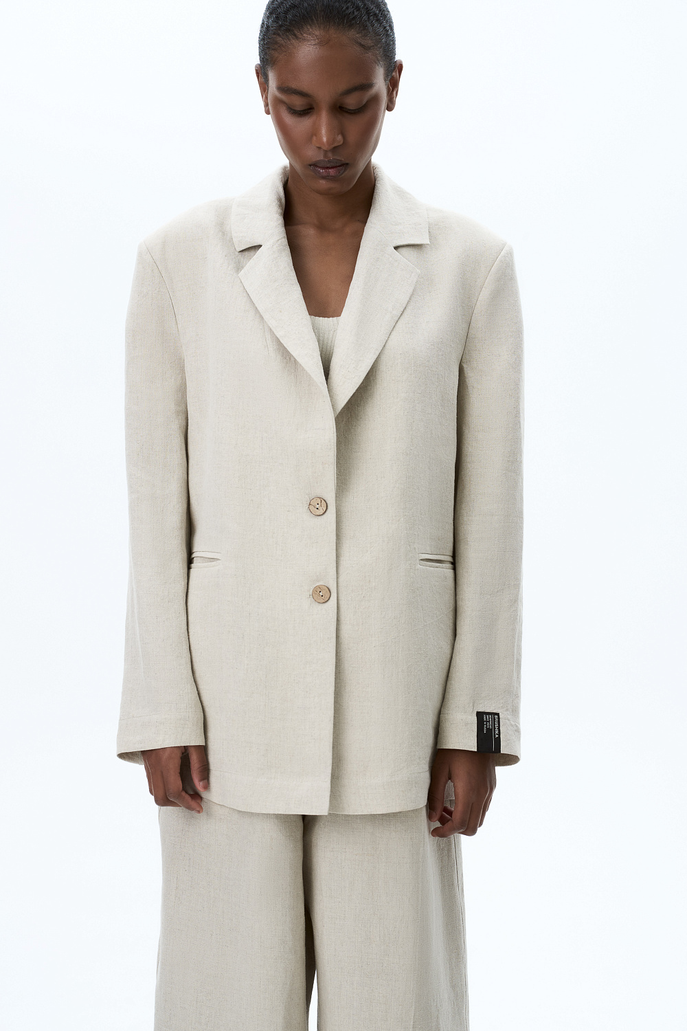 Single-breasted jacket made of hemp fabric. Straight-fit silhouette, front flap pockets and logo on the sleeve. The use of hemp fabric gives the product special strength and wear resistance, and its natural origin emphasizes the environmental friendliness of this item.