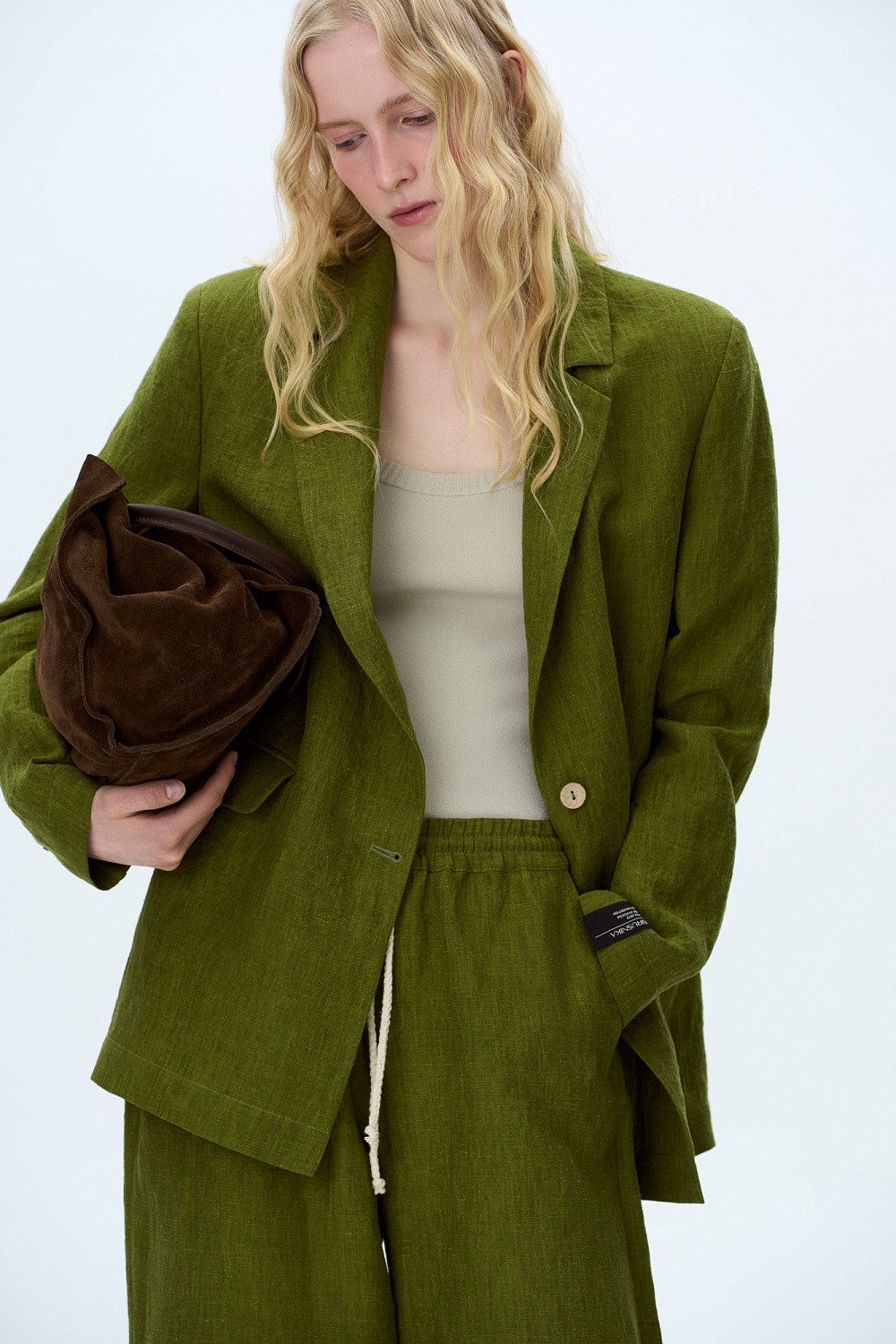 Single-breasted jacket made of hemp fabric. Straight-fit silhouette, front flap pockets and logo on the sleeve. The use of hemp fabric gives the product special strength and wear resistance, and its natural origin emphasizes the environmental friendliness of this item.