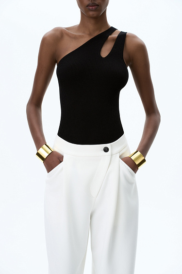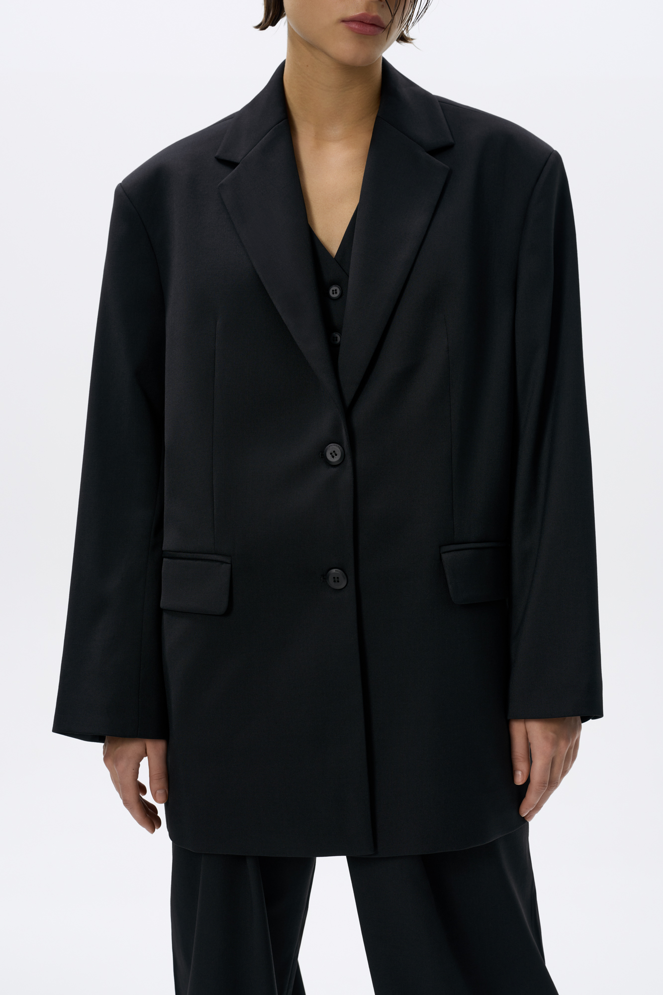Classic single-breasted jacket. The model has a loose silhouette with a turn-down collar, wide sleeves and patch pockets with flaps. Button closure. The product is lined.