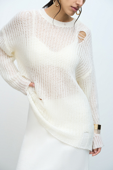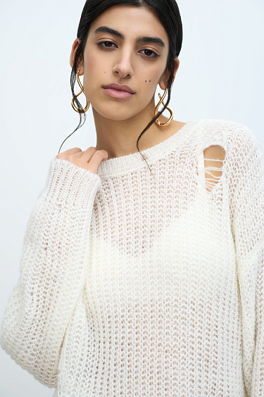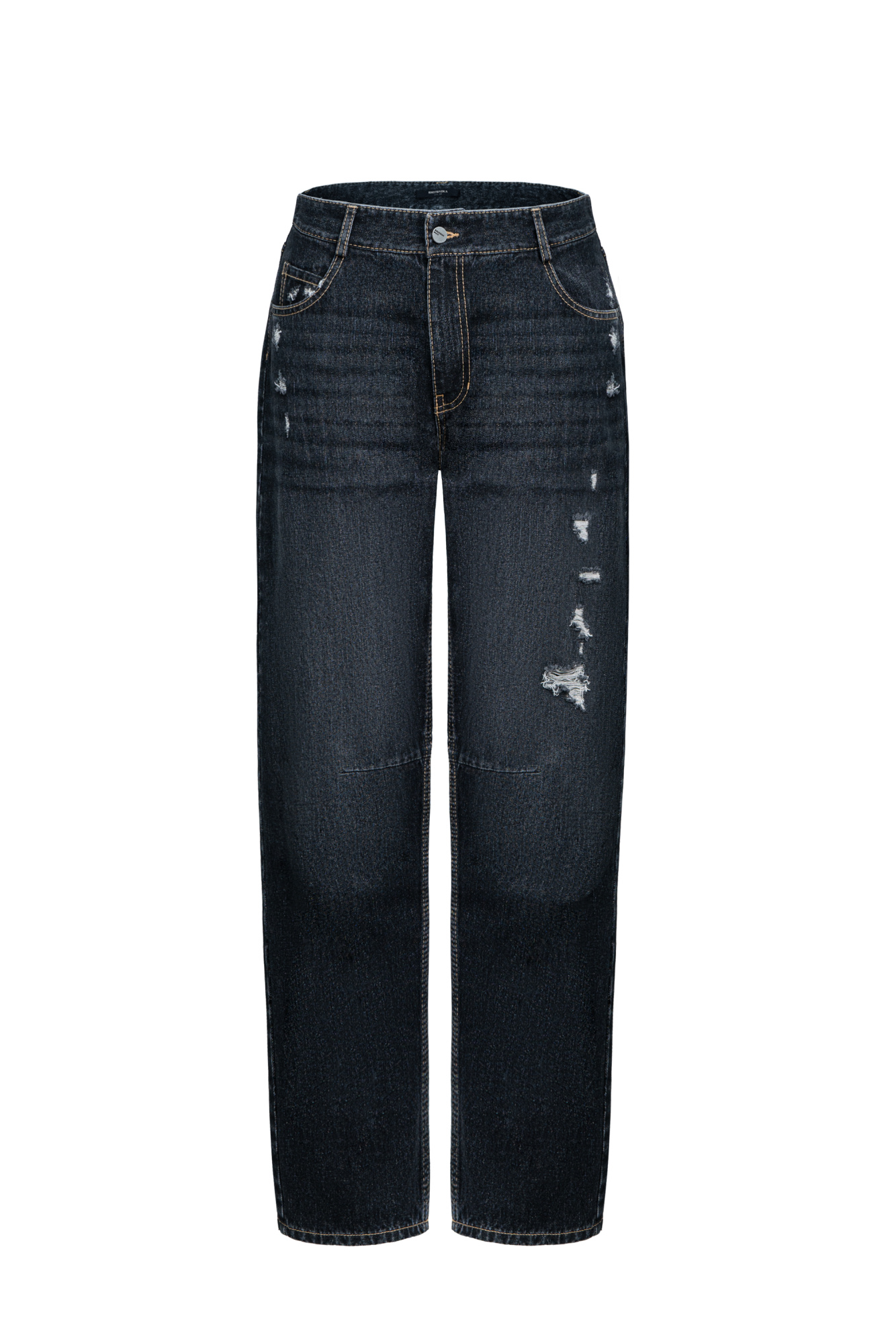 100% cotton jeans with medium rise. Straight silhouette model with grunge style slits and a distressed effect. Zip and button closure.