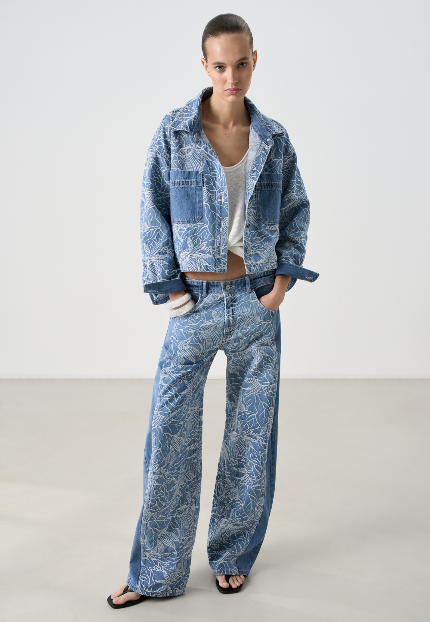 Printed 100% cotton jeans. The model has a straight cut, with vertical darts and wide stripes. Belt loops, zipper and button closure. 4 pockets.