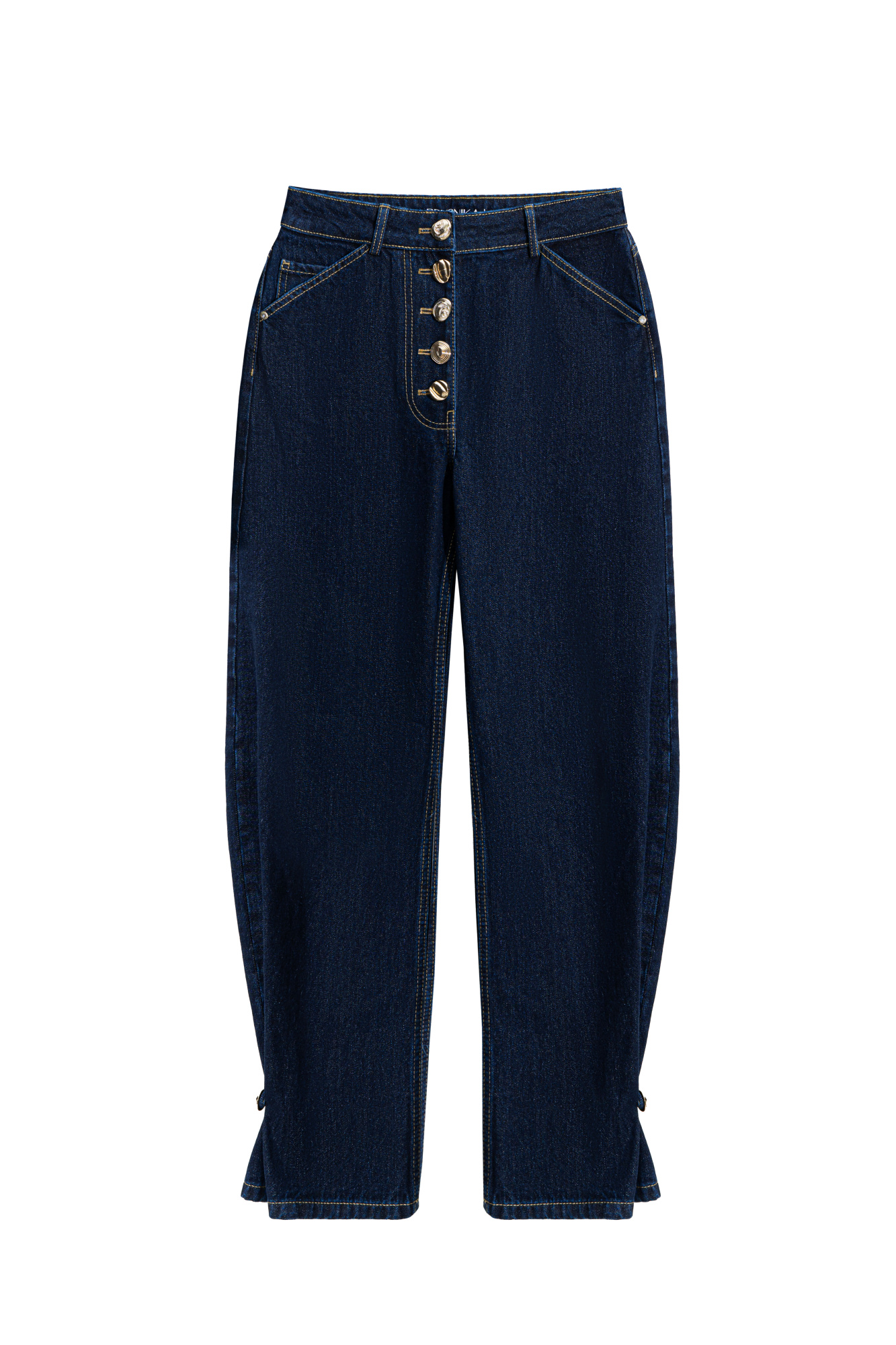 Barrel fit jeans made from 100% cotton. Features five pockets, accent button closure and button cuffs.