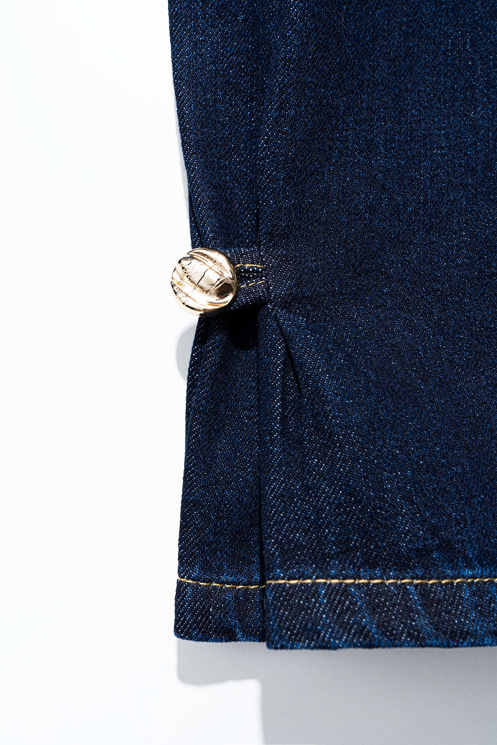 Barrel fit jeans made from 100% cotton. Features five pockets, accent button closure and button cuffs.