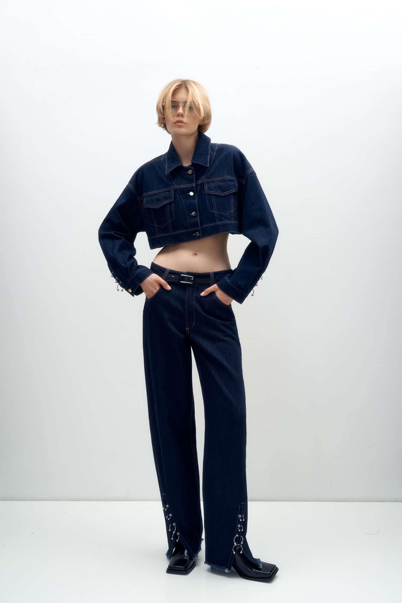 100% cotton jeans with front slits and metal rings decor. Straight model with concealed zipper and button closure. You can complete the look with denim jacket in the same style.