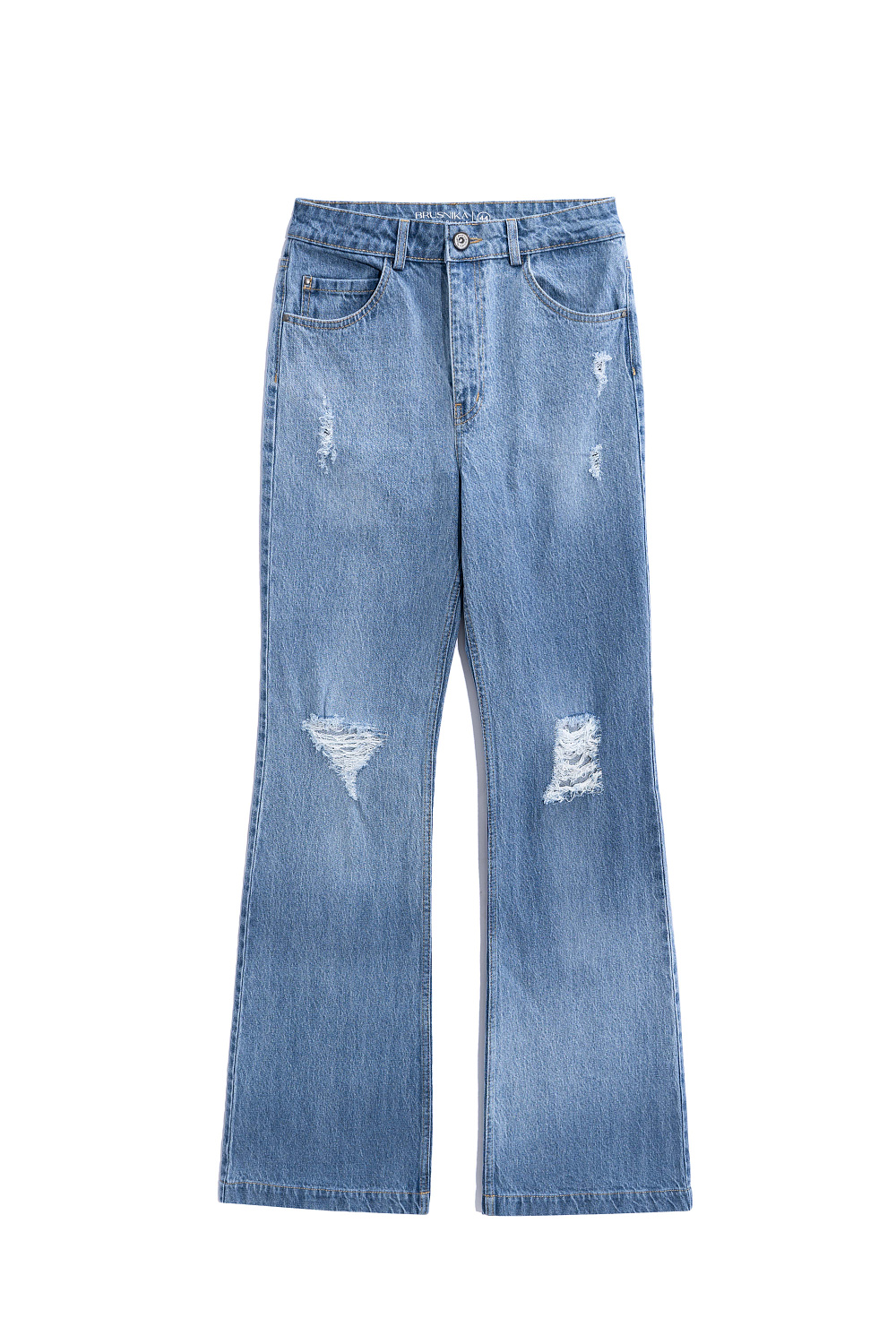 Straight-fit jeans with a slight flare. Features belt loops, side and back pockets and zip and button closure. The product is decorated with cuts in grunge style.