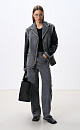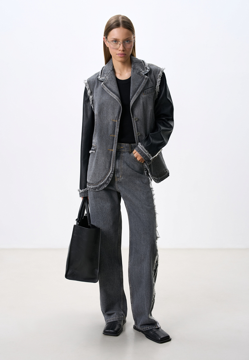 Cotton jeans with eco-leather details and knitted stripes. The model has a straight silhouette, with side pockets, jeans and eco-leather loops on the waistband for a belt. Zip and button closure. The product is decorated with a torn texture.