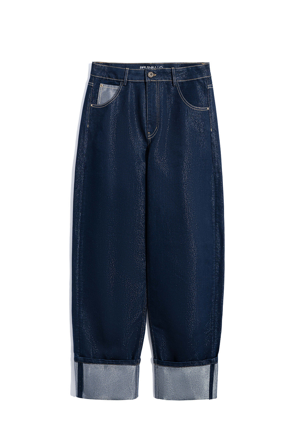 Relaxed fit jeans made of cotton with metallic thread. Features five pockets, belt loops and a zipper and snap closure. The product is decorated with high gates.