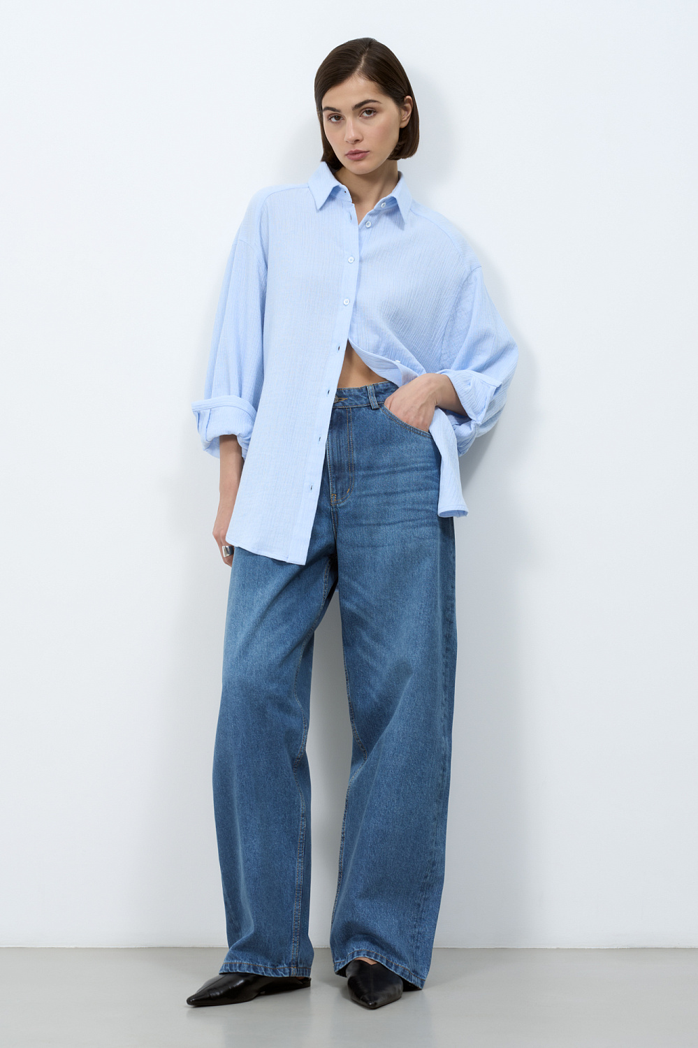 Straight-leg jeans made of 100% cotton. Relaxed, mid-rise model with five pockets. Zip and button closure.