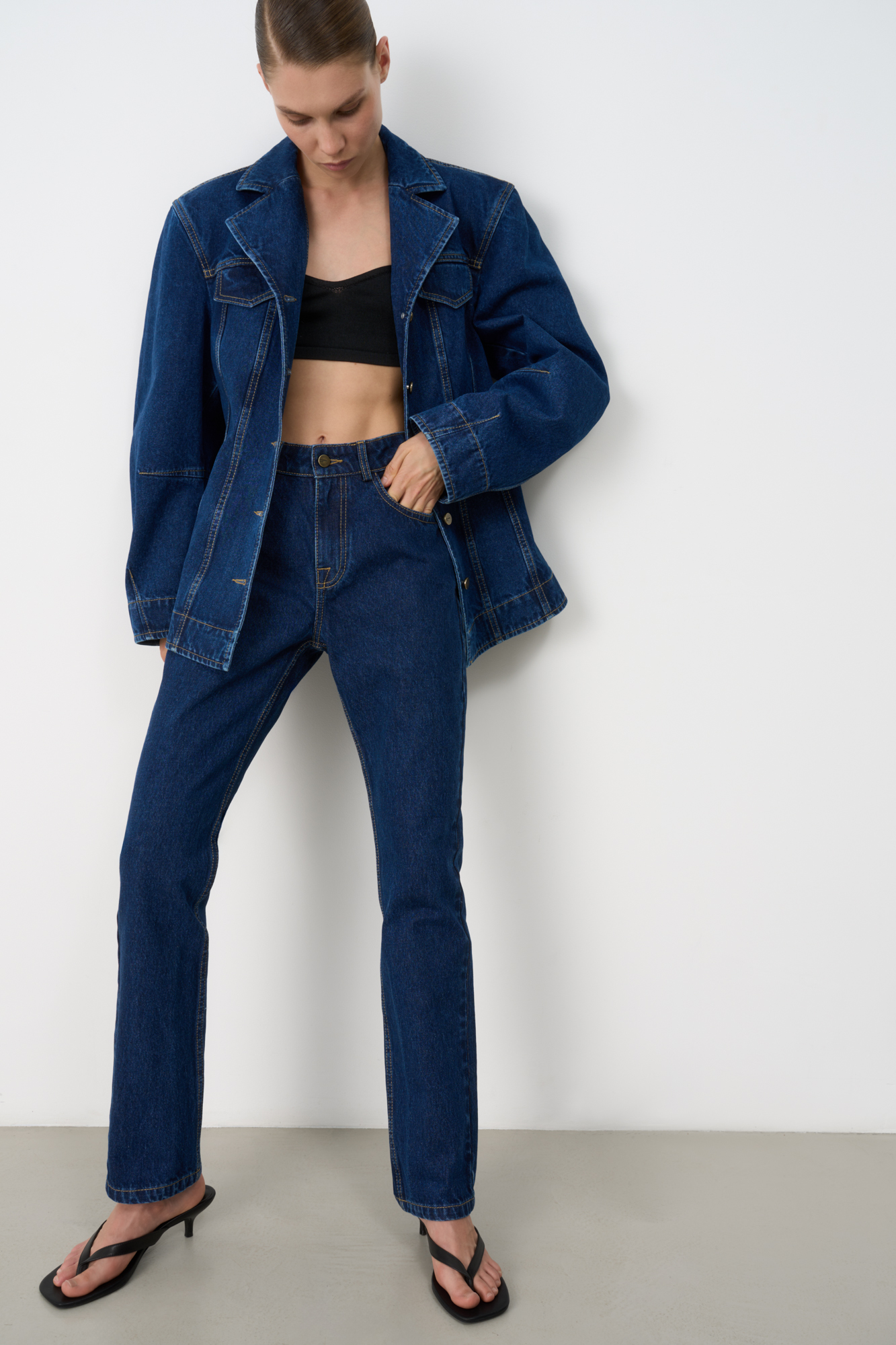High-waisted skinny jeans. The model has a straight cut and is tapered at the bottom. Five pockets. Zip and metal button closure.