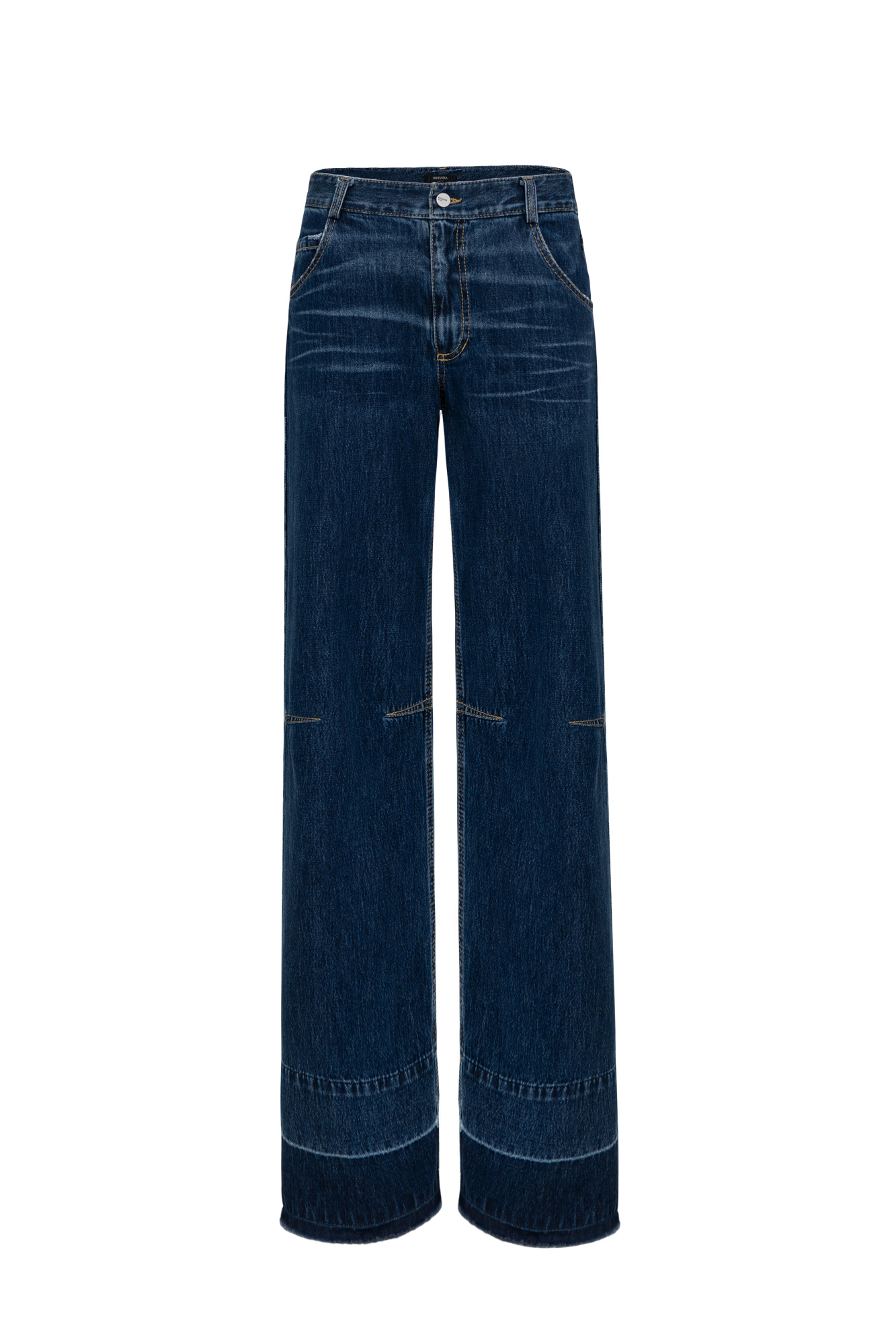 Straight-leg mid-rise jeans with distressed detailing and contrast stitching. Concealed zipper and button closure. Raw bottom and four pockets.