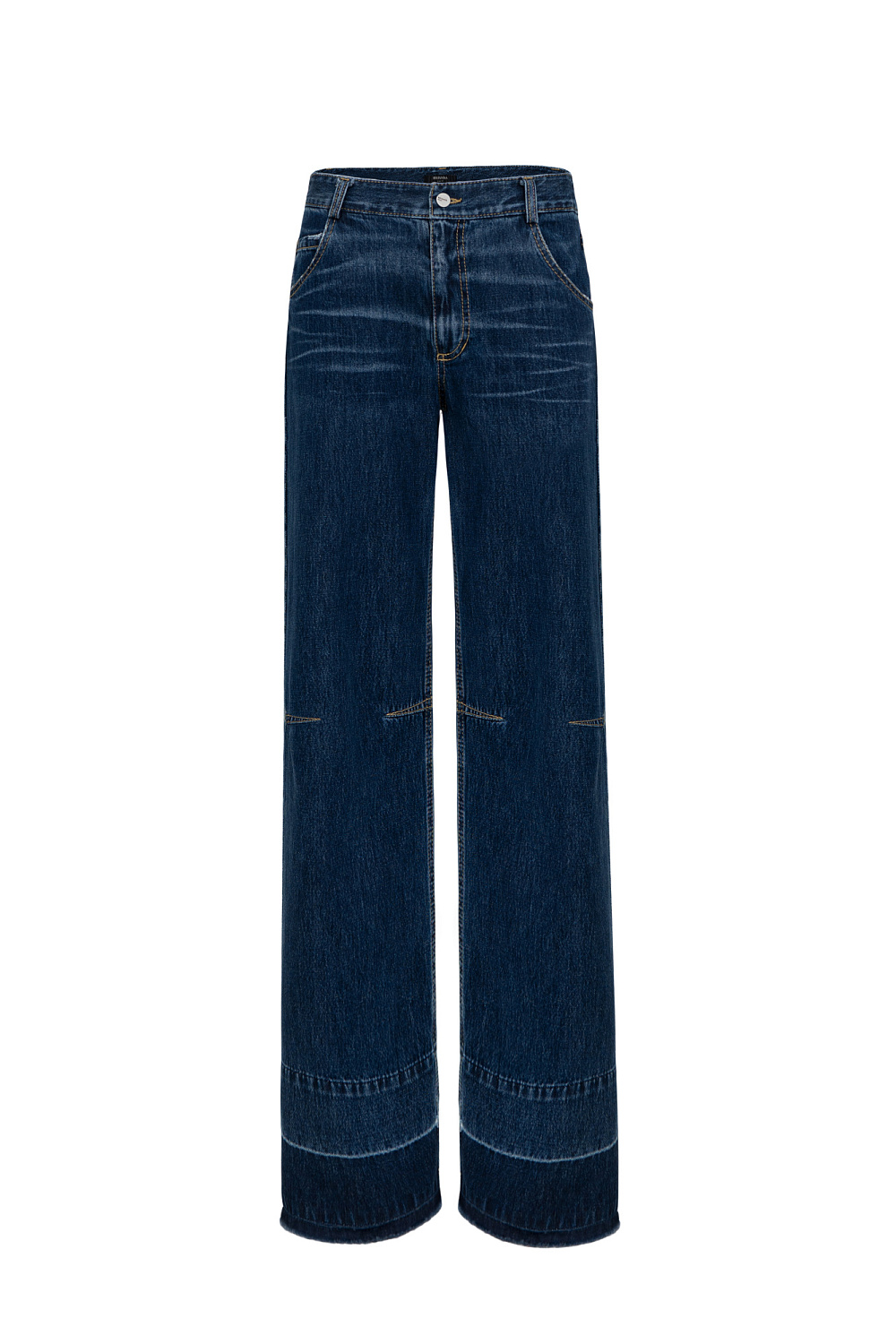 Straight-leg mid-rise jeans with distressed detailing and contrast stitching. Concealed zipper and button closure. Raw bottom and four pockets.