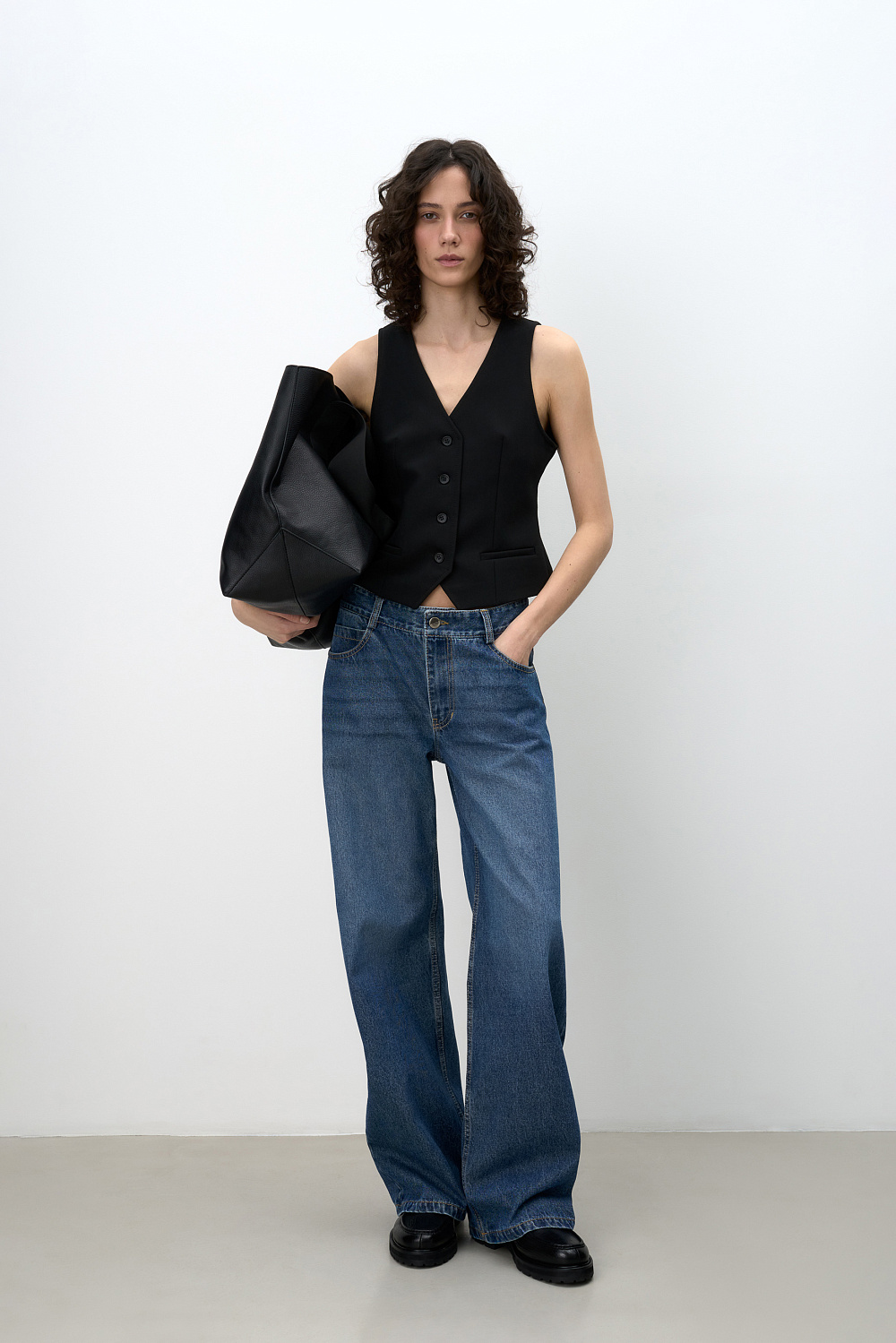 Straight wide-leg jeans made of 100% cotton with side pockets. Mid-rise waist, zip and metal button closure.