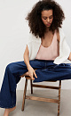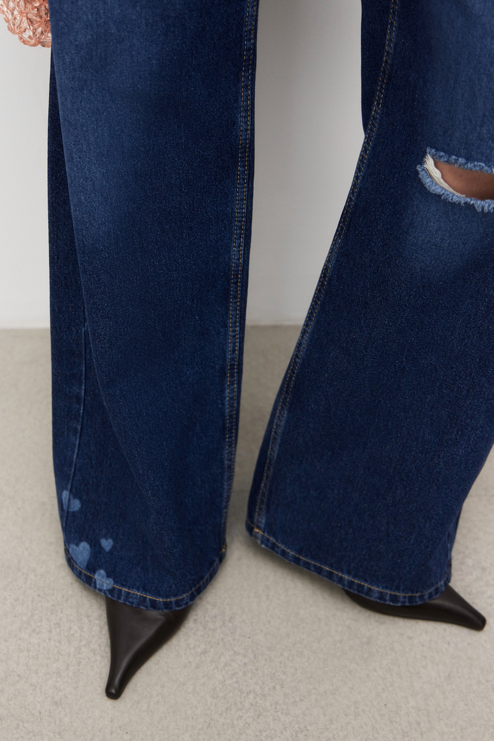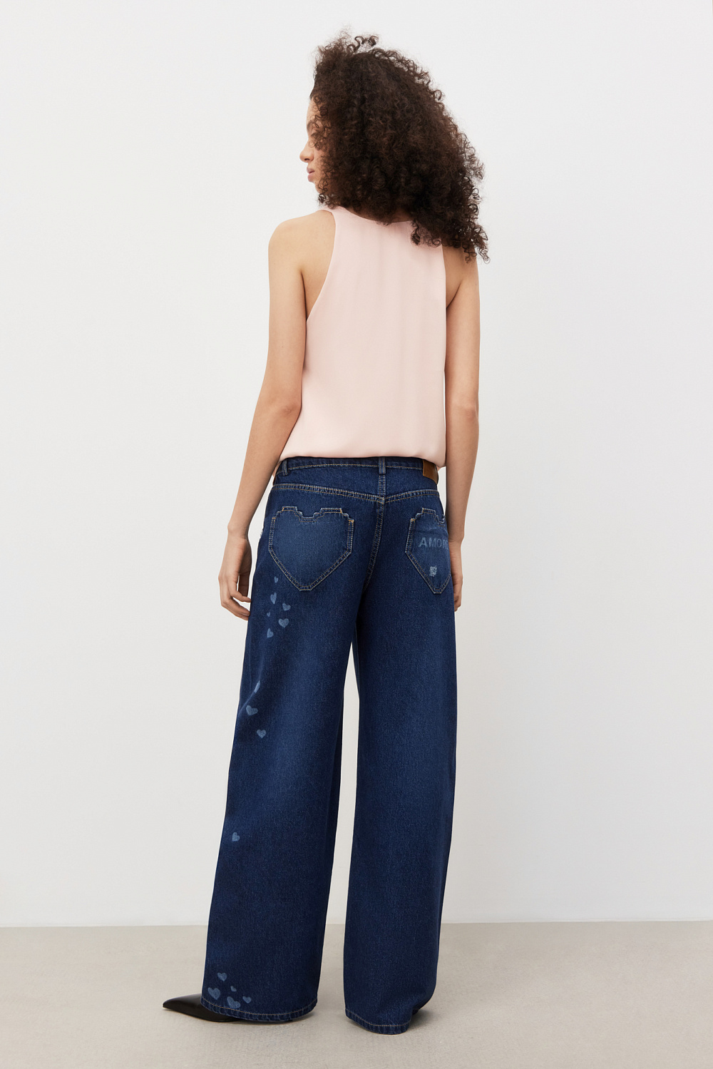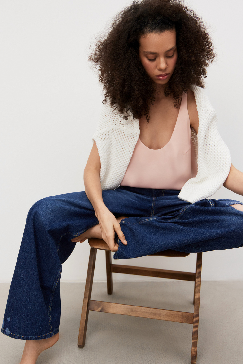 Mid-rise straight jeans with a cut and imitation of hearts. Zip and button fastening.