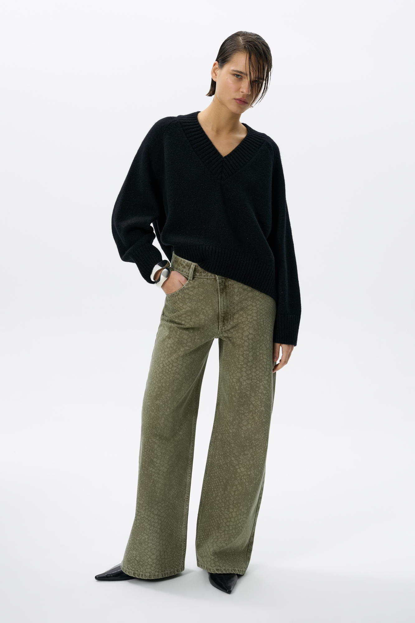 Jeans with an animal print that imitates snake scales. Straight silhouette model with mid rise. Five pockets. Zip and button closure.