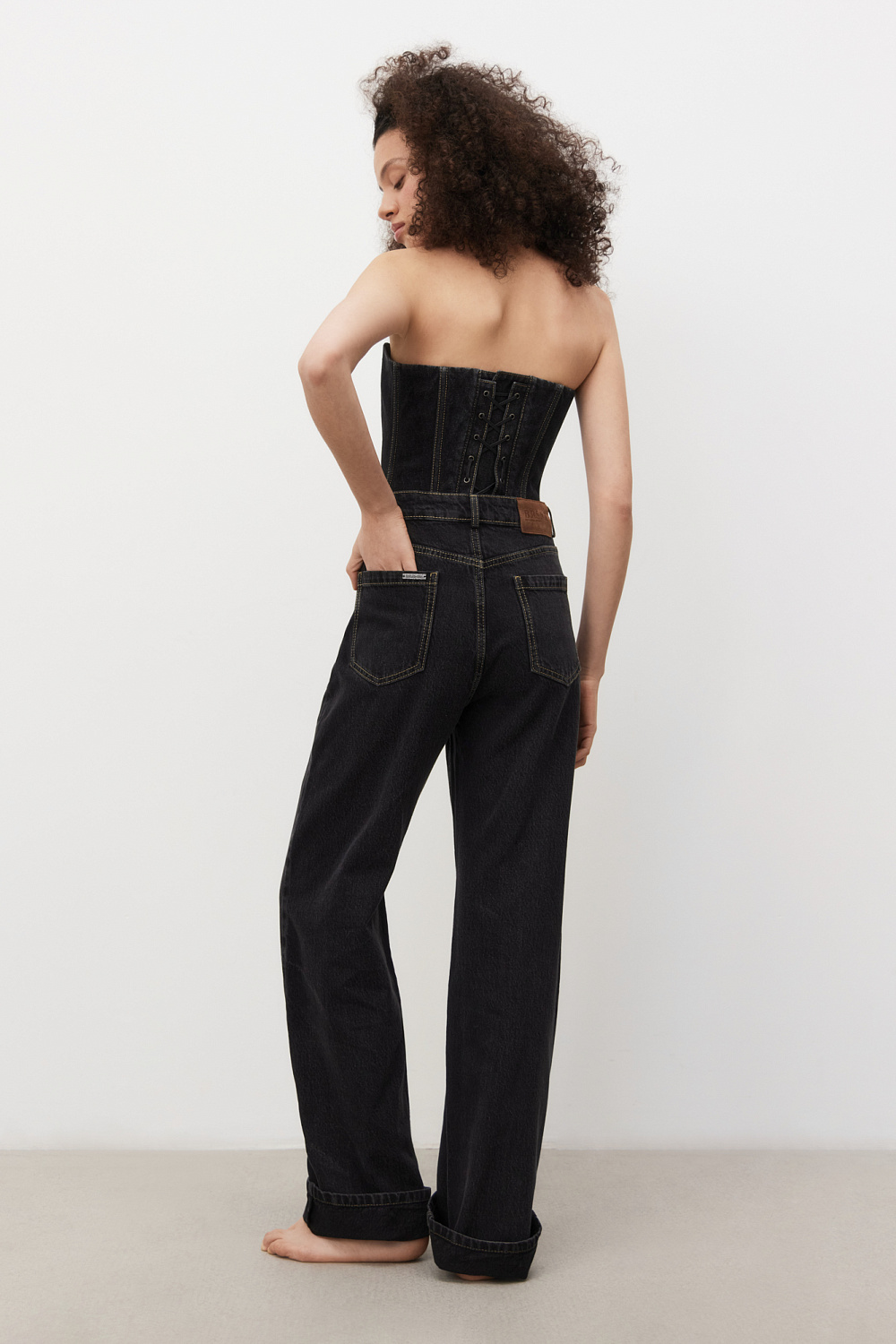 100% cotton jeans. The model has a straight, wide fit, a classic fit, five pockets, belt loops and a zipper and button closure. The effect of “marble” washing over the entire surface. Small pocket trimmed in brown eco-leather.