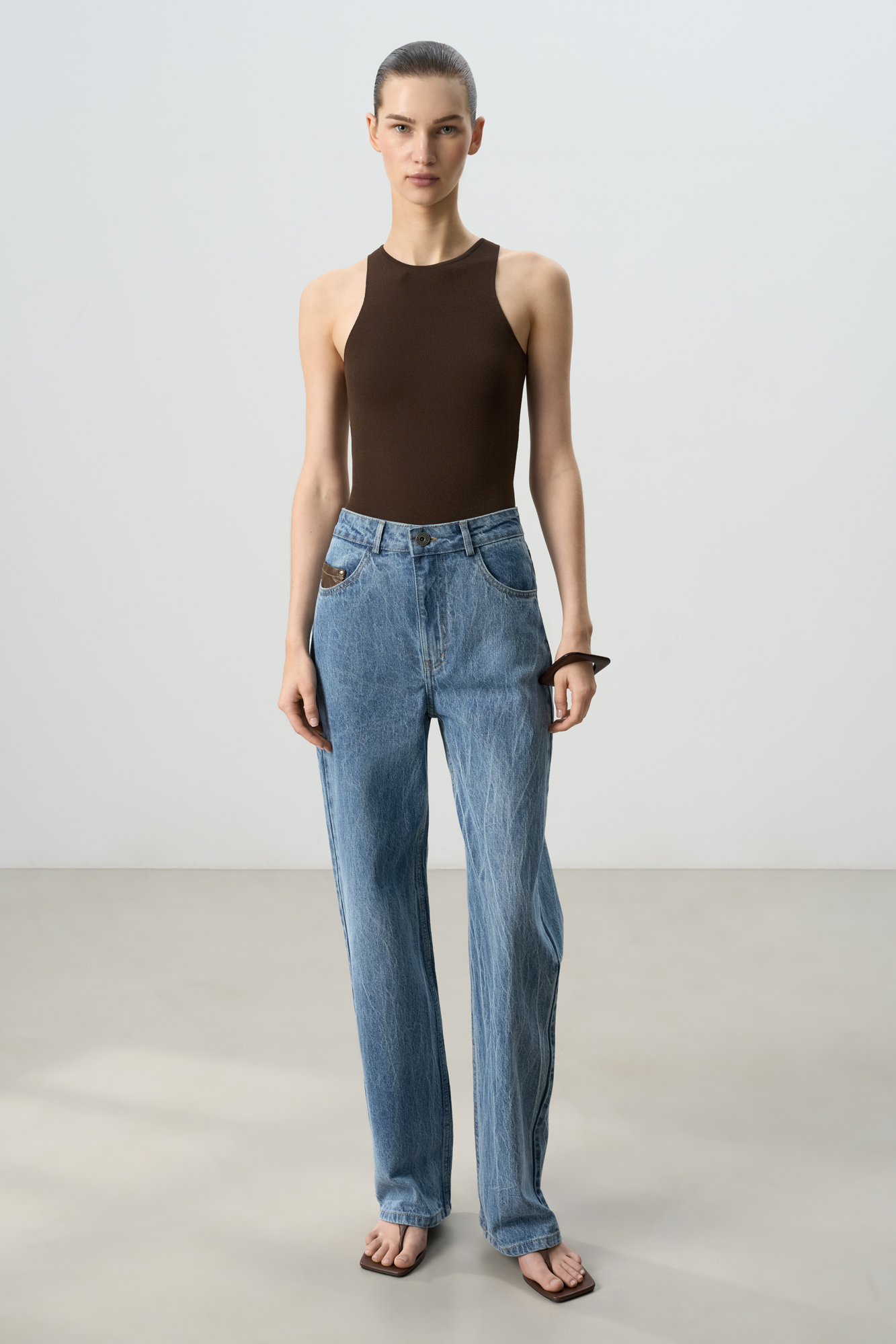 100% cotton jeans. The model has a straight, wide fit, a classic fit, five pockets, belt loops and a zipper and button closure. The effect of “marble” washing over the entire surface. Small pocket trimmed in brown eco-leather.