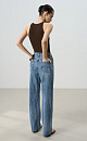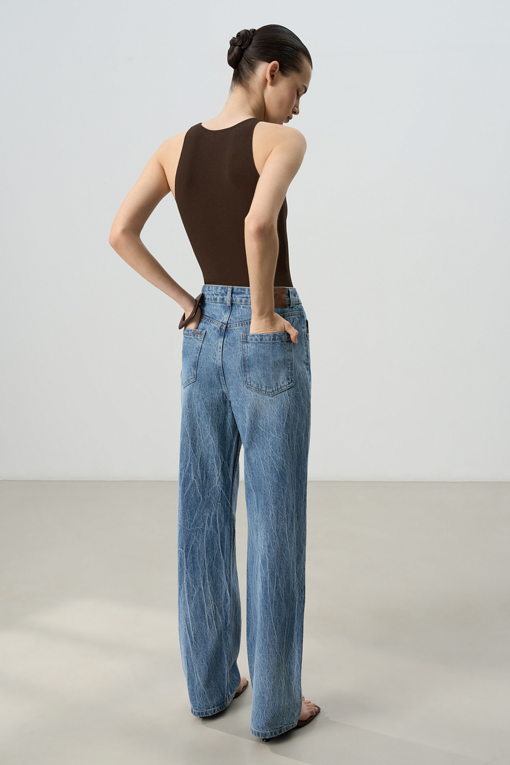 100% cotton jeans. The model has a straight, wide fit, a classic fit, five pockets, belt loops and a zipper and button closure. The effect of “marble” washing over the entire surface. Small pocket trimmed in brown eco-leather.