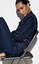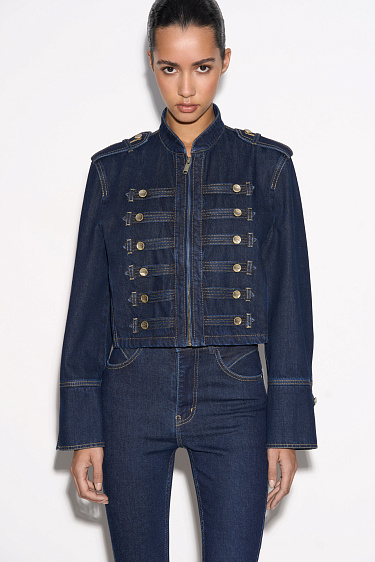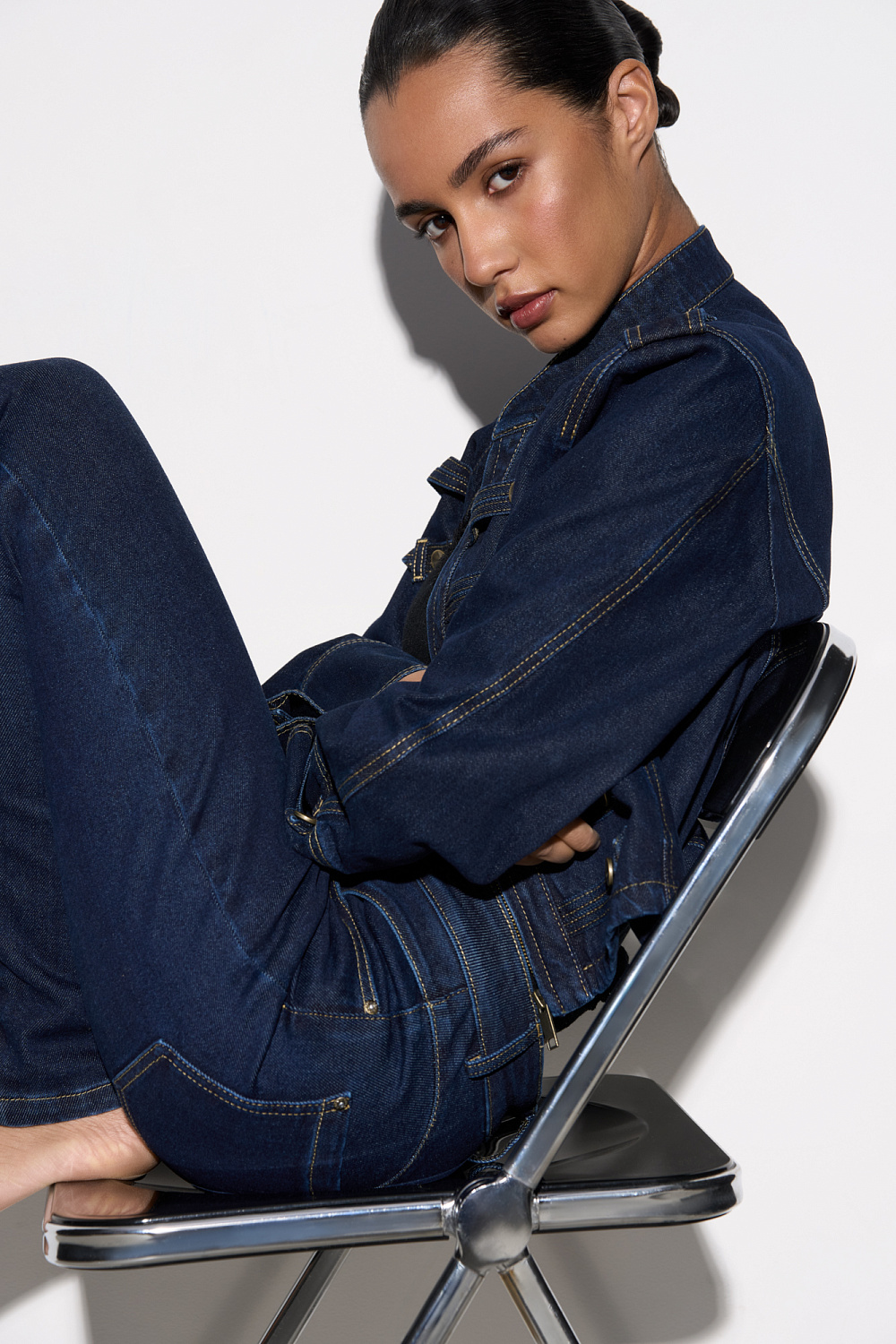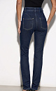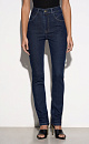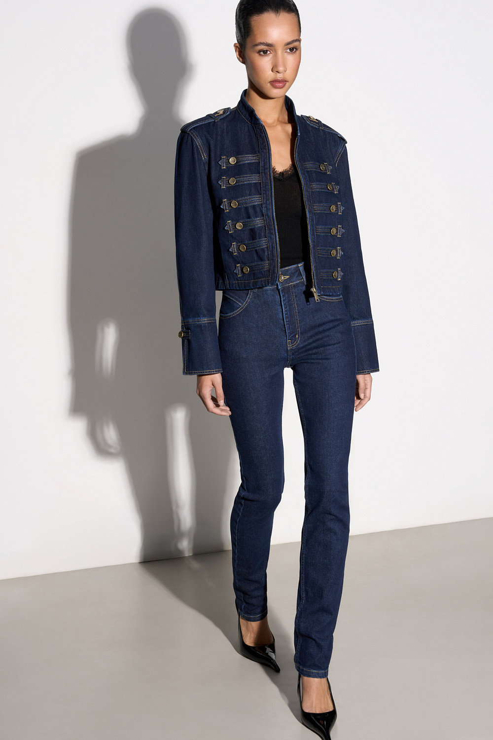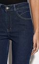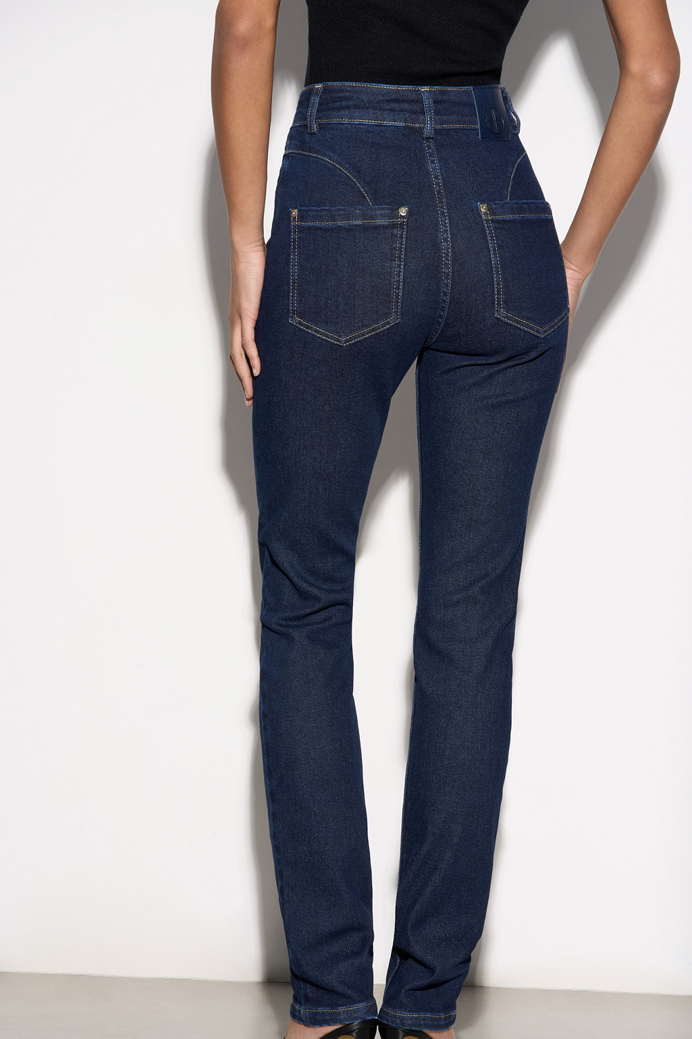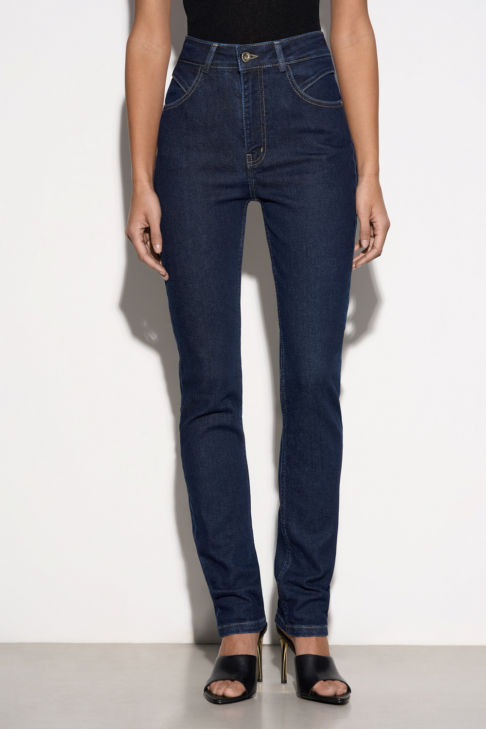 Slim fit jeans with a high rise. Fitted model with decorative stitching on the waistband. Four pockets, zipper and metal button closure.