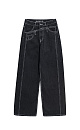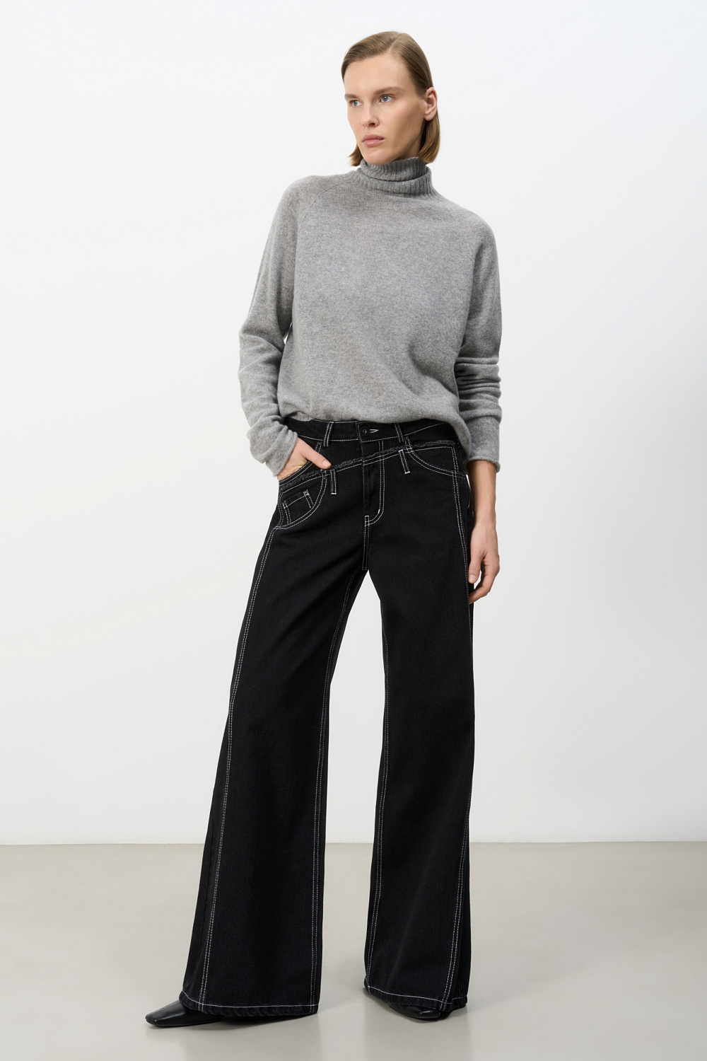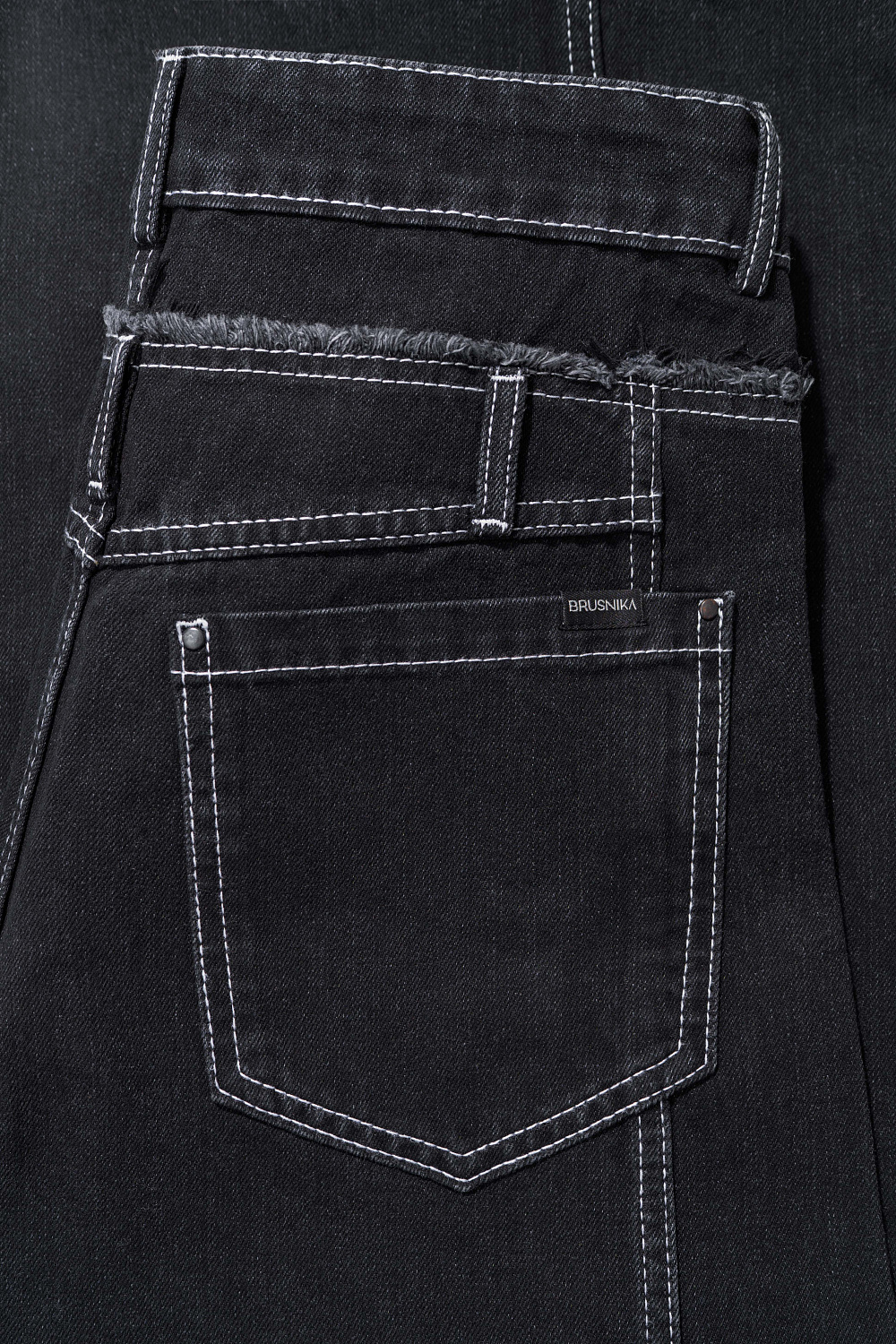 Straight jeans with an asymmetrical belt and slight flare. Five pockets. Zip and metal button closure.