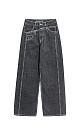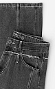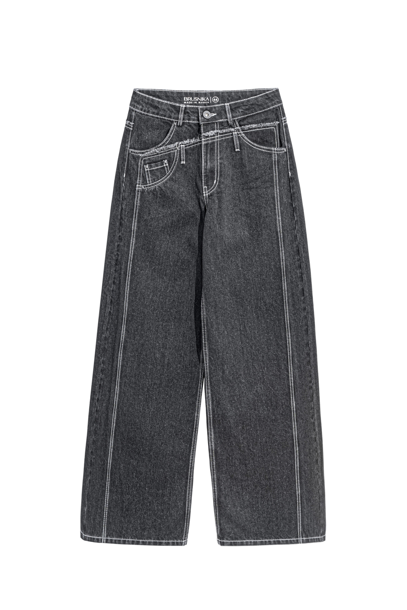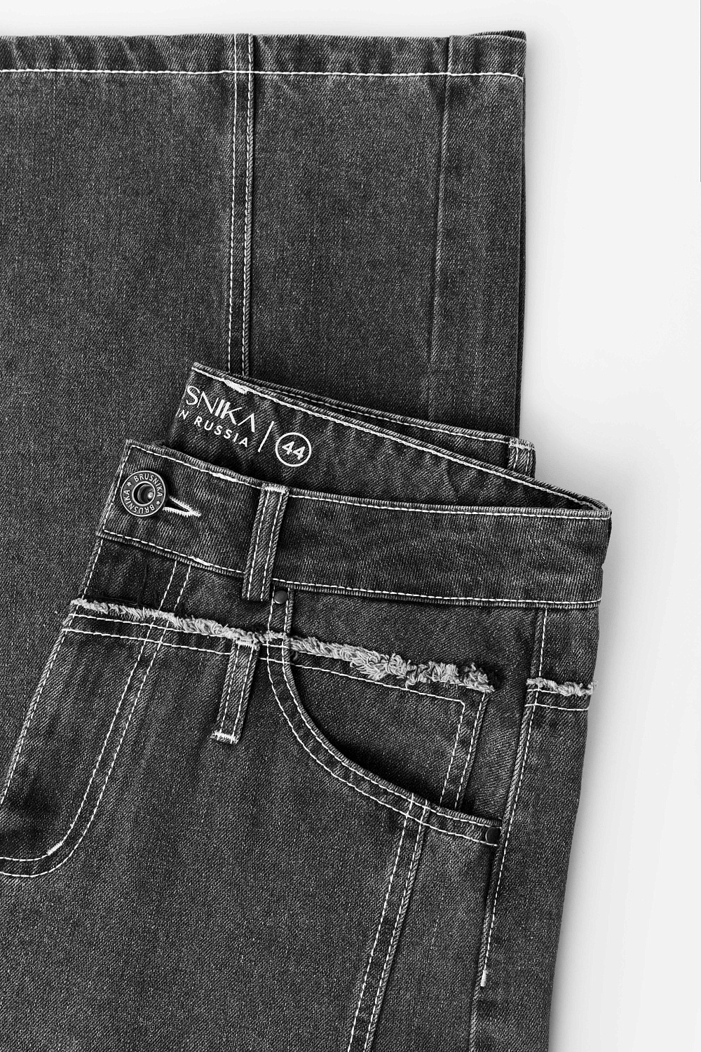 Straight jeans with an asymmetrical belt and slight flare. Five pockets. Zip and metal button closure.