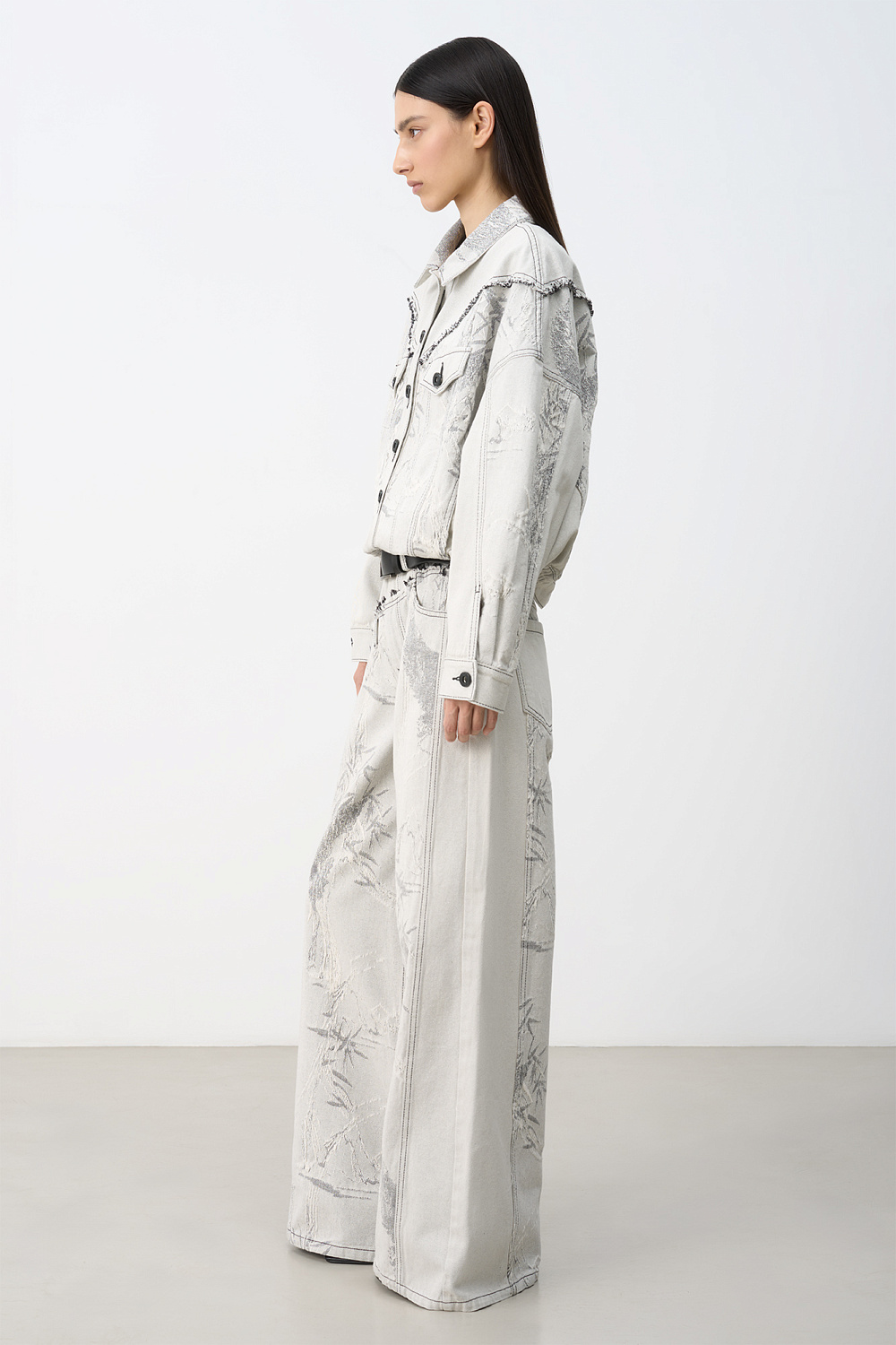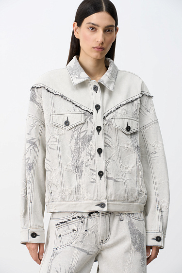 Printed jeans with an asymmetric double-waist detail. Straight cut model with slight flare. Five pockets. Zip and metal button closure. You can complete the look with a same style jacket.