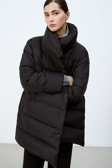 Knitted viscose jumper with stand-up collar. Loose silhouette model with dropped shoulders and zip fastening. The sleeve cuffs, collar and hem are ribbed.