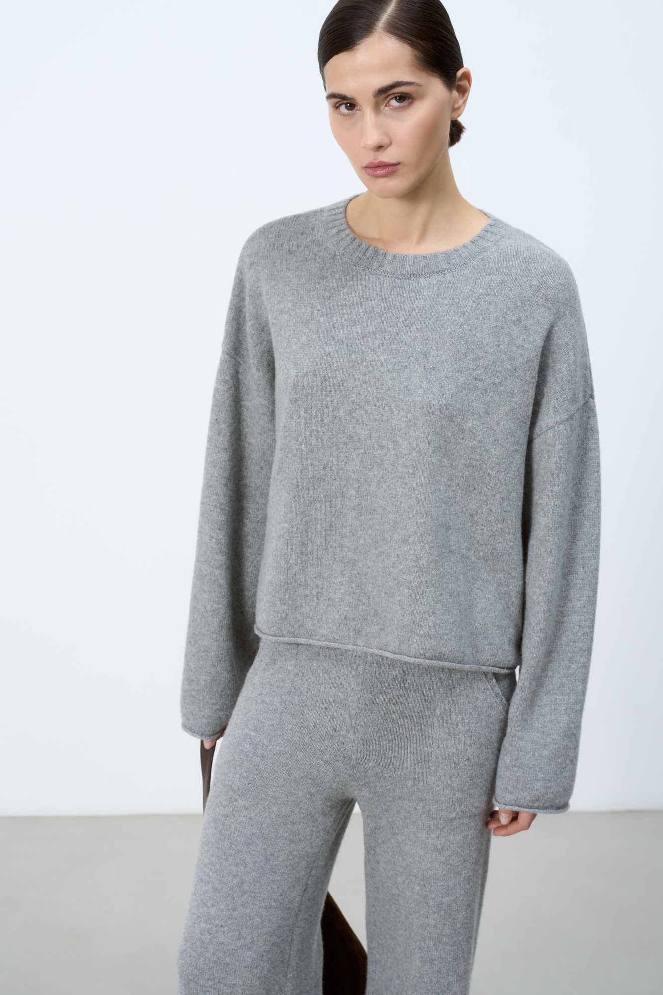 Jumper made of 100% cashmere. The model has a loose silhouette with dropped shoulders, a round neckline and rolls along the bottom of the product.
