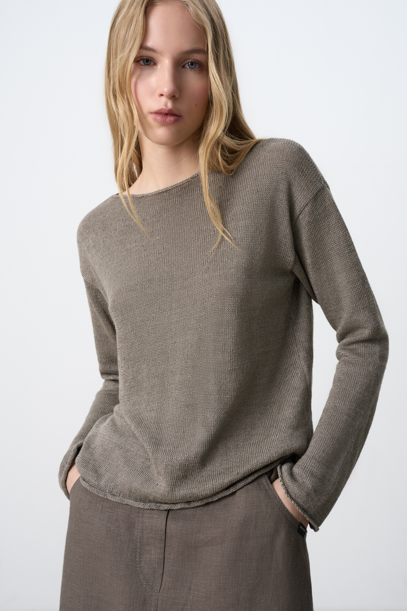 Knitted jumper made of 100% linen. The model has a loose fit, with dropped shoulders and a shallow neckline. The edges of the product are decorated with rollers.